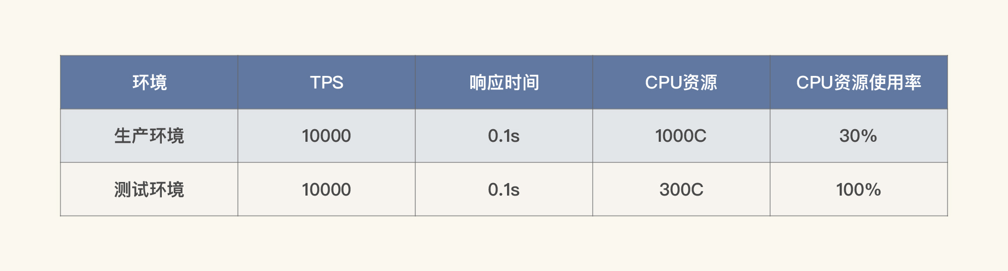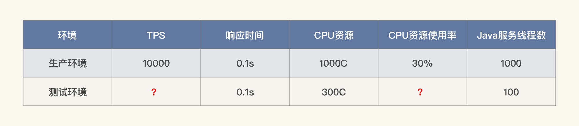 显然,这时候表格中两个问号代表的数据就不一样了。通过计算你就可以知道,测试环境要想达到1000TPS,而资源使用率也只能用到1/10(也就是30C)了。