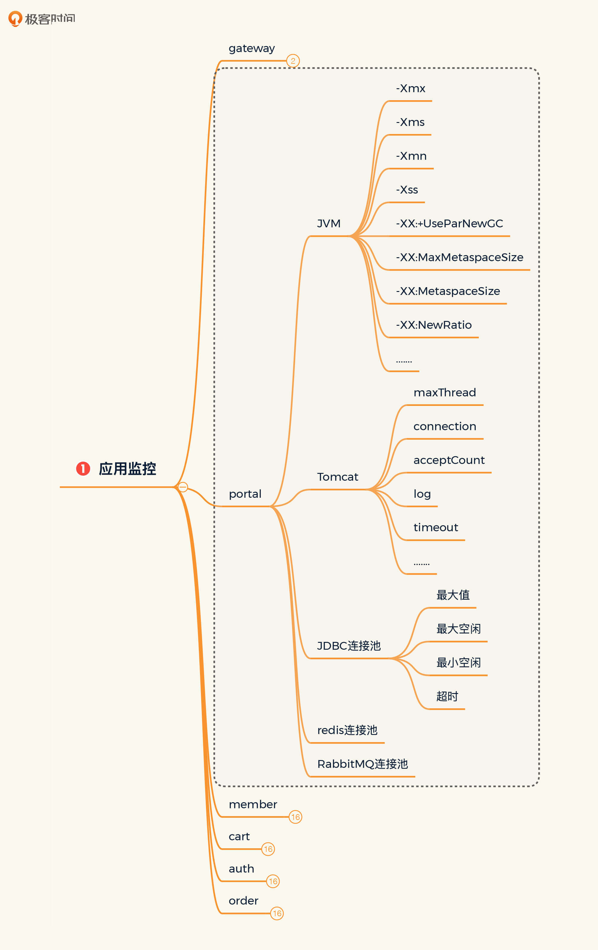 在这个文件中,并非所有的参数都与性能相关,你只需要根据我前面说的类型(比如线程数、超时、队列、连接、缓存等)自己筛选就好了。另外,我根据自己的工作经验,把其中重要的参数都标红了,当然这也只是给你借鉴。在你自己的项目中,你可以按性能配置树中的逻辑罗列自己的参数列表。