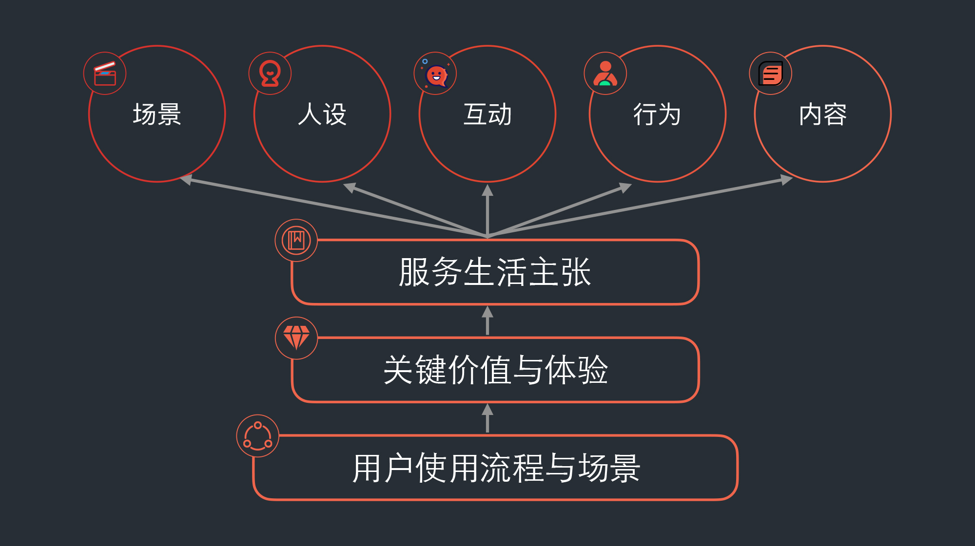 - 第四层则是将主张拆解为场景设计、人设、互动、行为、内容等设计主题。