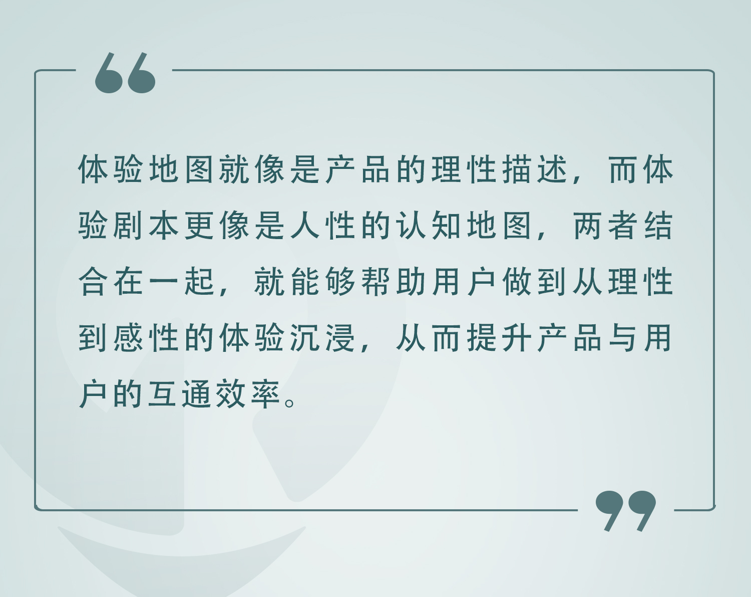 体验地图就像是产品的理性描述,而体验剧本更像是人性的认知地图,两者结合在一起,就能够帮助用户做到从理性到感性的体验沉浸,从而提升产品与用户的互通效率。