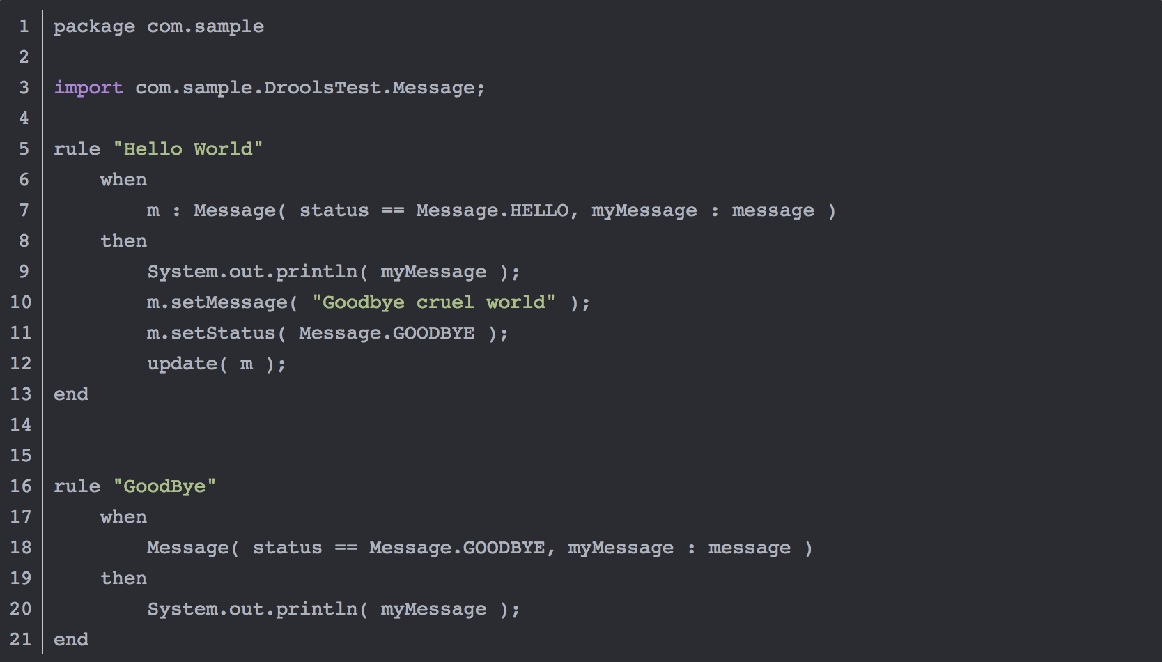 虽然Drools号称简单易用,但实际上其规则语言还是和编程语言比较类似,在实际应用的时候普通业务人员面对这样的规则语言,学习成本和理解成本还是比较高的,例如下面这个样例(https://blog.csdn.net/ouyangshixiong/article/details/46315273):
