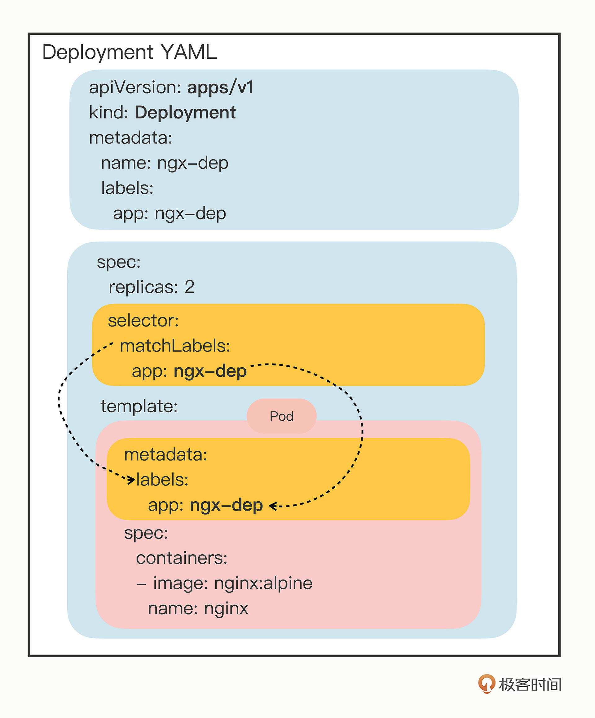 所以我还是画了一张图,用不同的颜色来区分Deployment YAML里的字段,并且用虚线特别标记了 matchLabels 和 labels 之间的联系,希望能够帮助你理解Deployment与被它管理的Pod的组合关系。