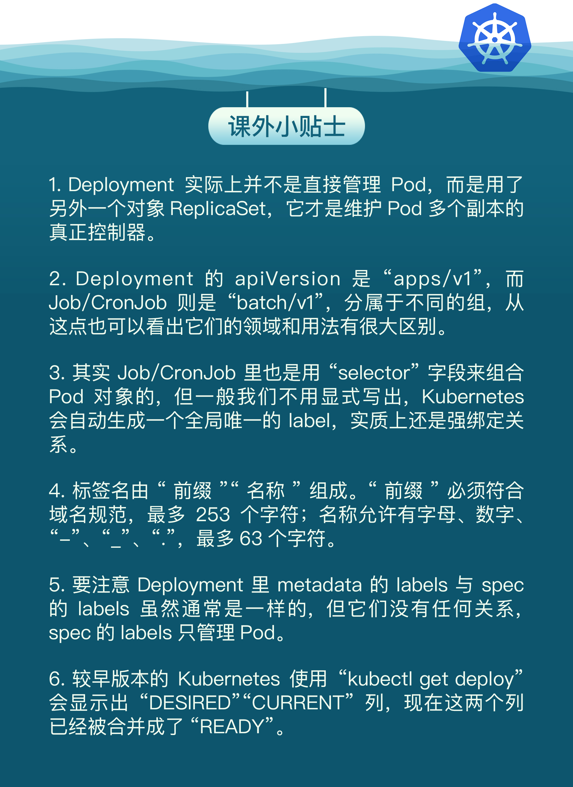 好了,今天我们学习了Kubernetes里的一个重要的对象:Deployment,它表示的是在线业务,和Job/CronJob的结构类似,也包装了Pod对象,通过添加额外的控制功能实现了应用永不宕机,你也可以再对比一下[第13讲]来加深对它的理解。
