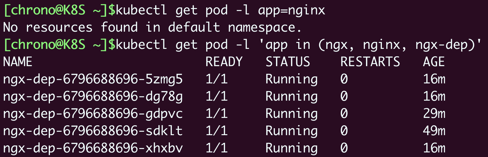 看两个例子,第一条命令找出“app”标签是 nginx 的所有Pod,第二条命令找出“app”标签是 ngx、nginx、ngx-dep 的所有Pod: