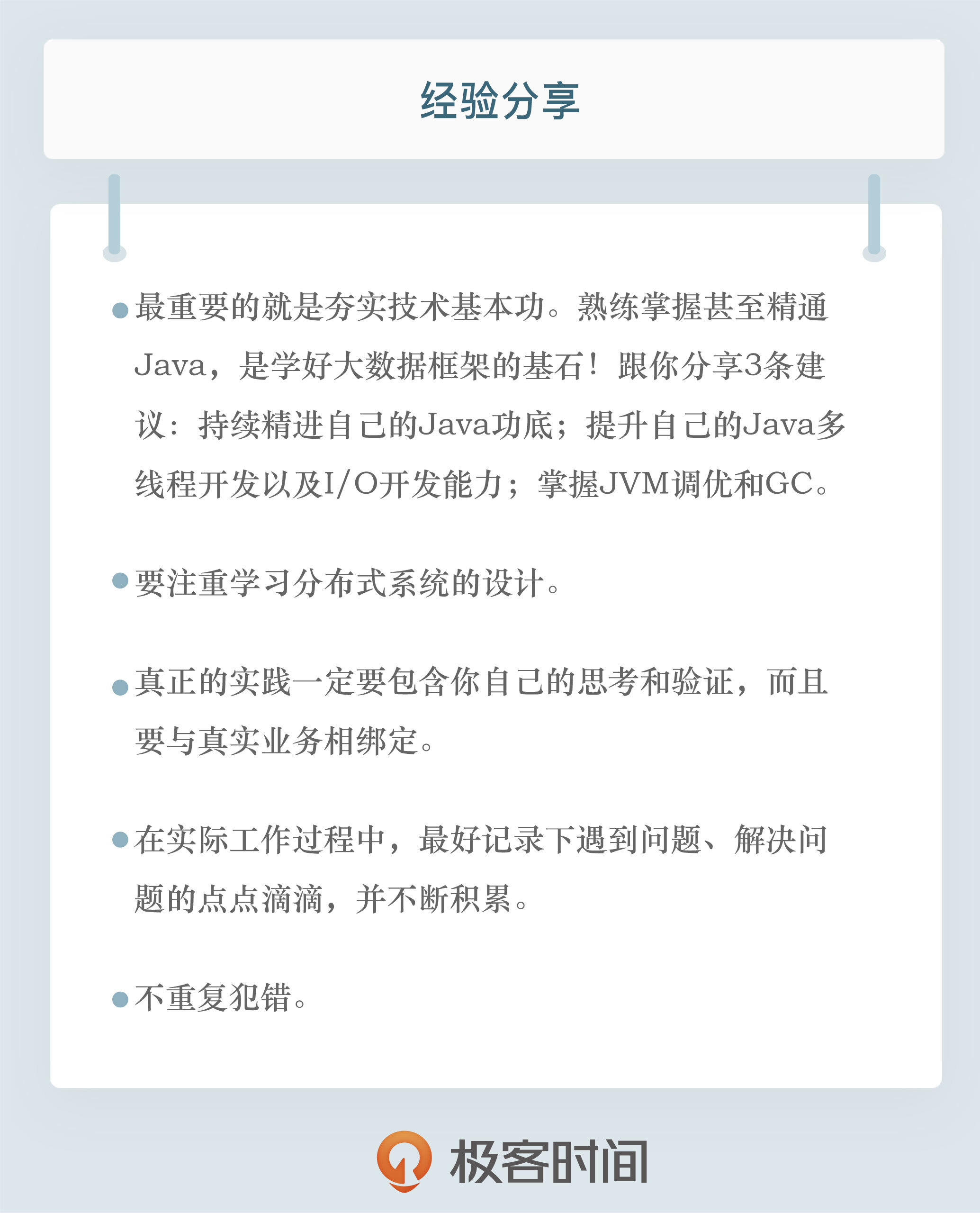 在专栏的最后,我想再和你分享一些学习大数据框架的个人经验。这些经验不仅仅适用于学习Kafka,对于其他框架甚至是分布式系统的学习,都是适用的。
