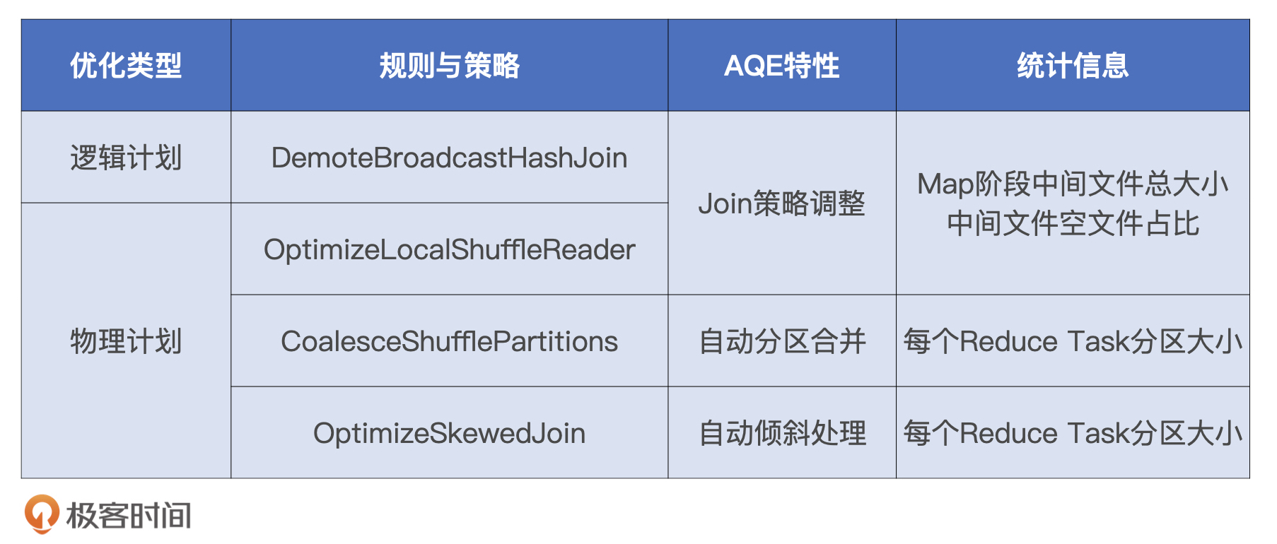 **AQE既定的规则和策略主要有4个,分为1个逻辑优化规则和3个物理优化策略。**我把这些规则与策略,和相应的AQE特性,以及每个特性仰仗的统计信息,都汇总到了如下的表格中,你可以看一看。