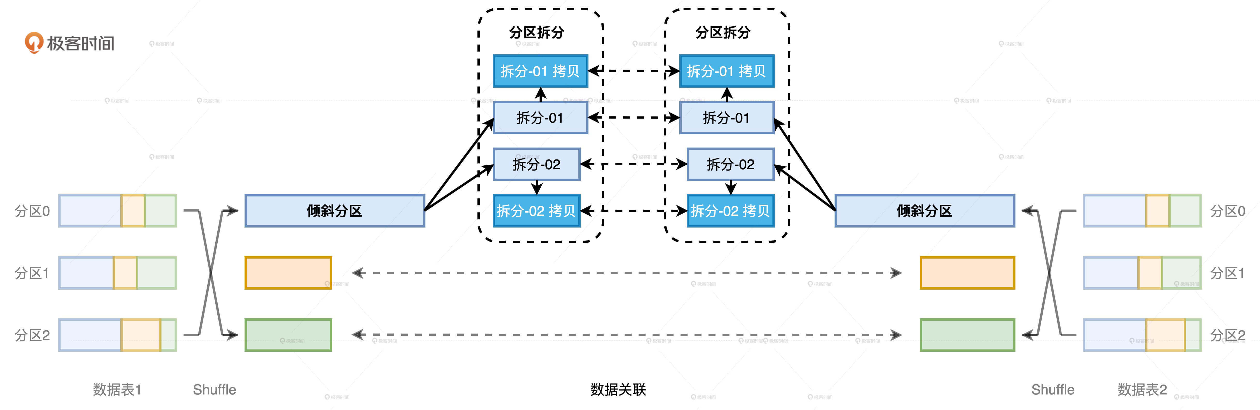 另外,在数据关联的场景中,对于参与Join的两张表,我们暂且把它们记做数据表1和数据表2,如果表1存在数据倾斜,表2不倾斜,那在关联的过程中,AQE除了对表1做拆分之外,还需要对表2对应的数据分区做复制,来保证关联关系不被破坏。