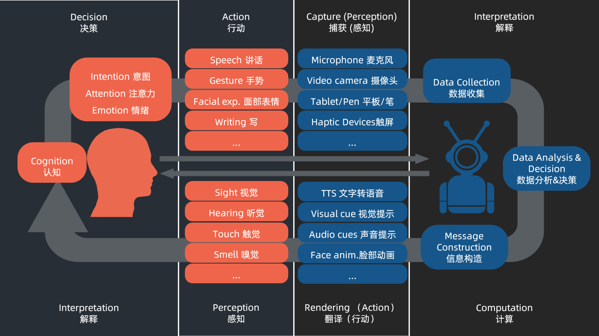 今天我们来聊聊多模态交互。到底什么是多模态交互呢?人和一个智能系统交互的时候,存在双方相互理解的过程,也就是双方都通过各种通道去表达,然后也都通过各种通道去分析对方的意图。多模态是站在智能系统一方来表达,它更多强调的是智能系统通过多个通道去捕获人和环境的信息,或者通过多个通道去呈现信息。