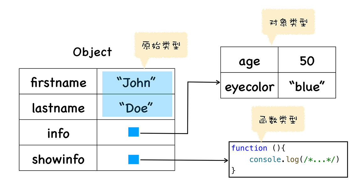 观察上图,我们可以看出来,对象的属性值有三种类型:
