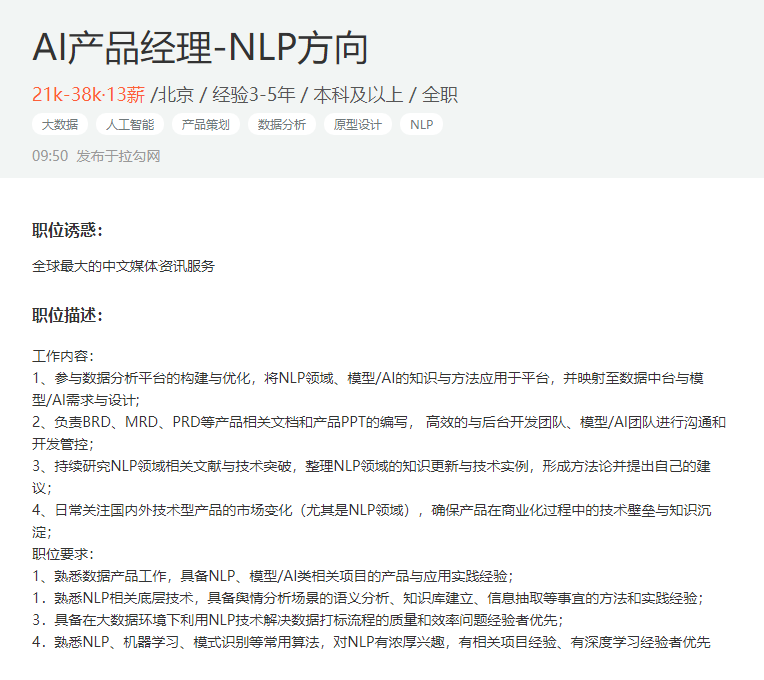 关于岗位:因为自然语言处理技术领域目前主要有智能客服、机器翻译、咨询处理、评论分析、智能医疗,所以相关的产品经理岗位也都是围绕这些方向进行招聘的。因此,在选定了某一个方向之后,你还需要去了解这些领域的相关知识。这里,我列举了一个自然语言处理方向的产品经理 JD,你可以作为参考。