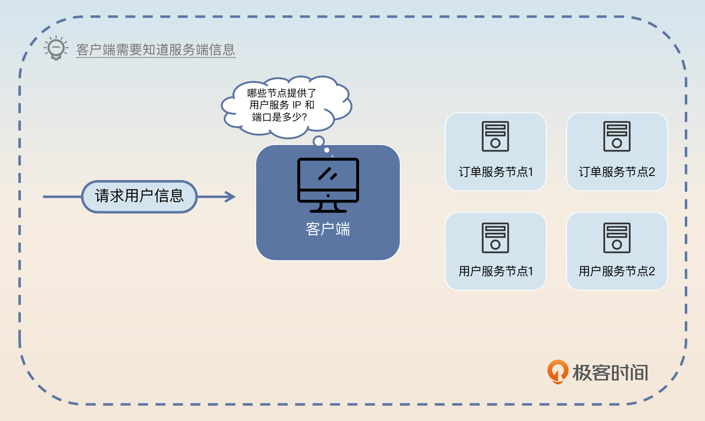 为什么我们会需要服务注册与发现呢?你设想这样一个场景,你的服务部署在不同的机房、不同的机器上,监听不同的端口。现在你的客户端收到了一个请求,要发送给服务端,那么你的客户端怎么知道哪些服务端能够处理这个请求呢?