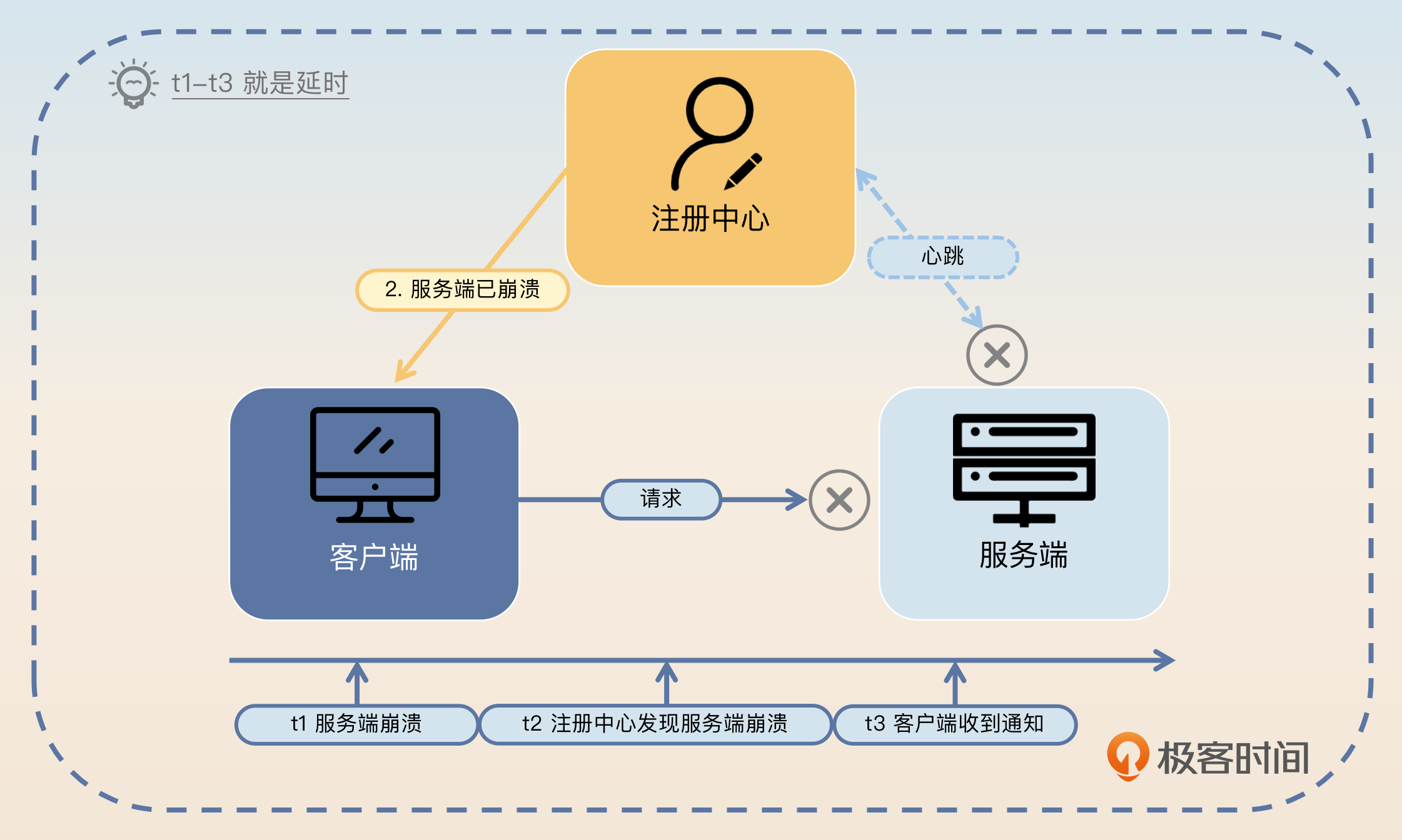 你可能在上面这张图片里注意到了,服务端崩溃之后注册中心和服务端之间的心跳就无法继续保持了。所以你得出一个简单的结论:如果注册中心和服务端之间的心跳断了,就认为服务端已经崩溃了。