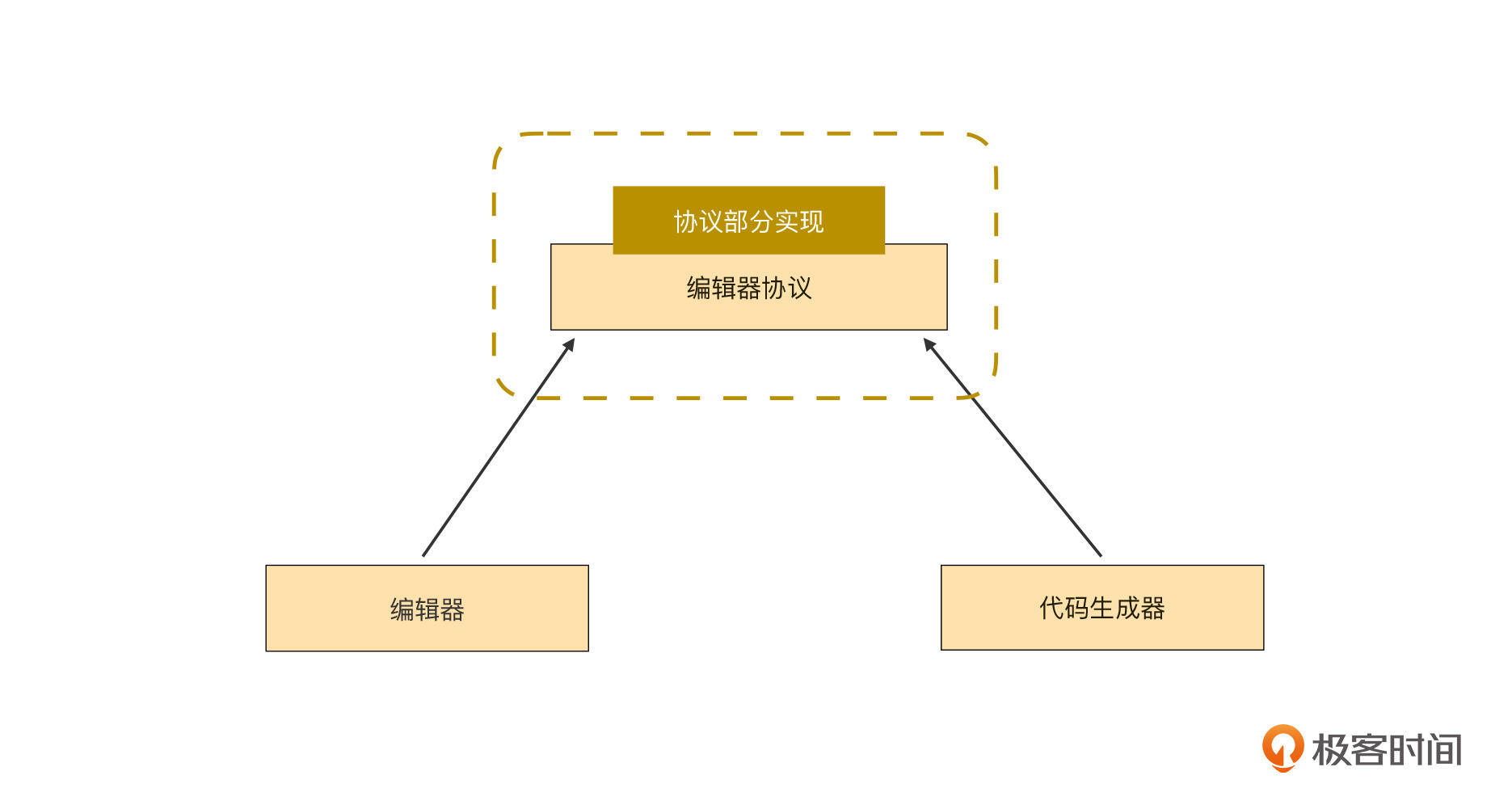 现在,再来看这张图,你会有更深的理解。编译器协议是抽象的,因为它只有一部分实现(参考前文的Property和SVD这两个抽象类),但抽象的基类完整地描述了生成代码会用到的所有API的定义。基于这份完整的API描述,我们就可以写出代码生成器的所有代码了,这份API描述就是图中所说的“编译器协议”。