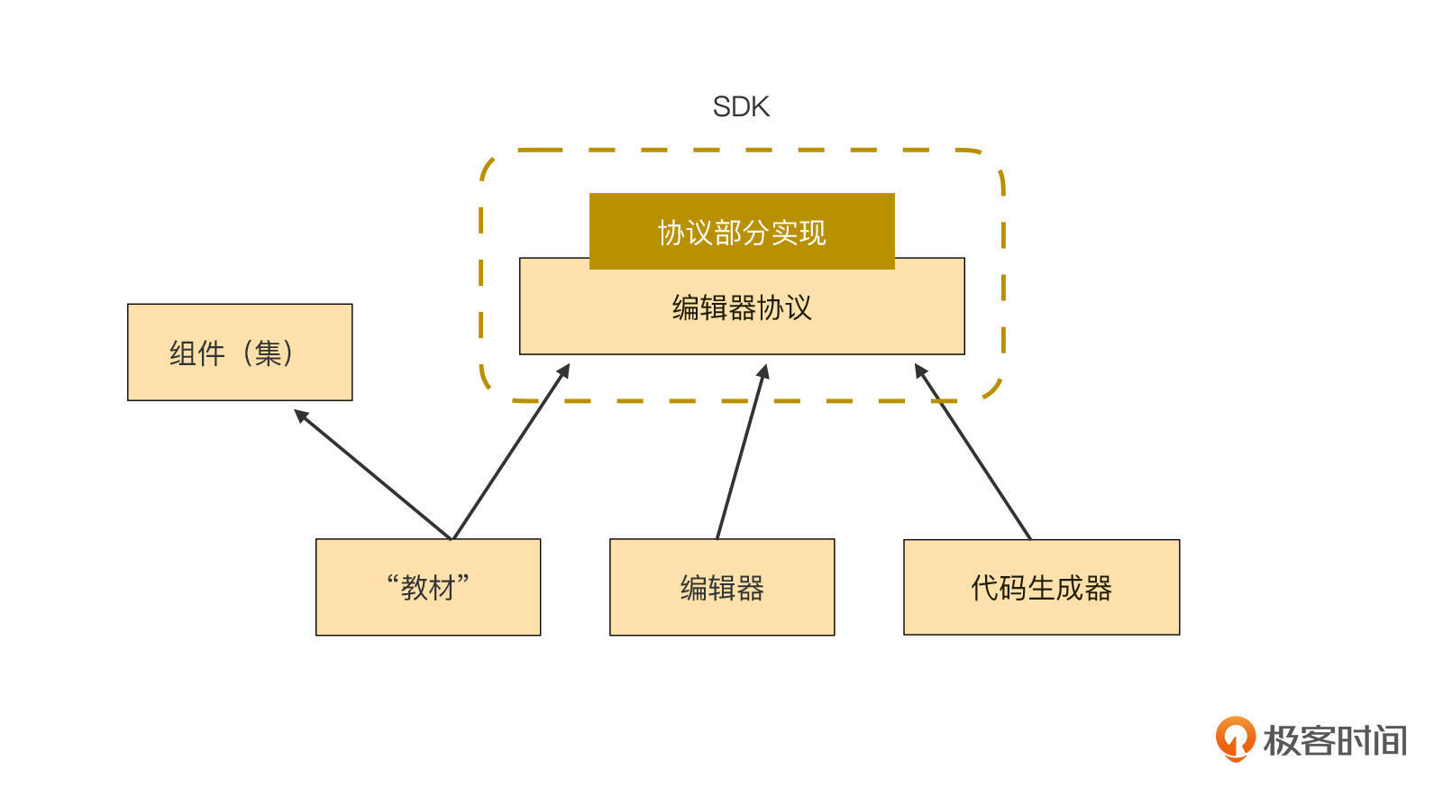 我们可以看到,“教材”、编辑器、代码生成器等模块都是低代码平台正常运行不可获取的重要部分,但图中它们三者之间却没有直接的耦合关系,相互隔离。这样的代码层次分明,职责明确,是一种非常好的关系结构: