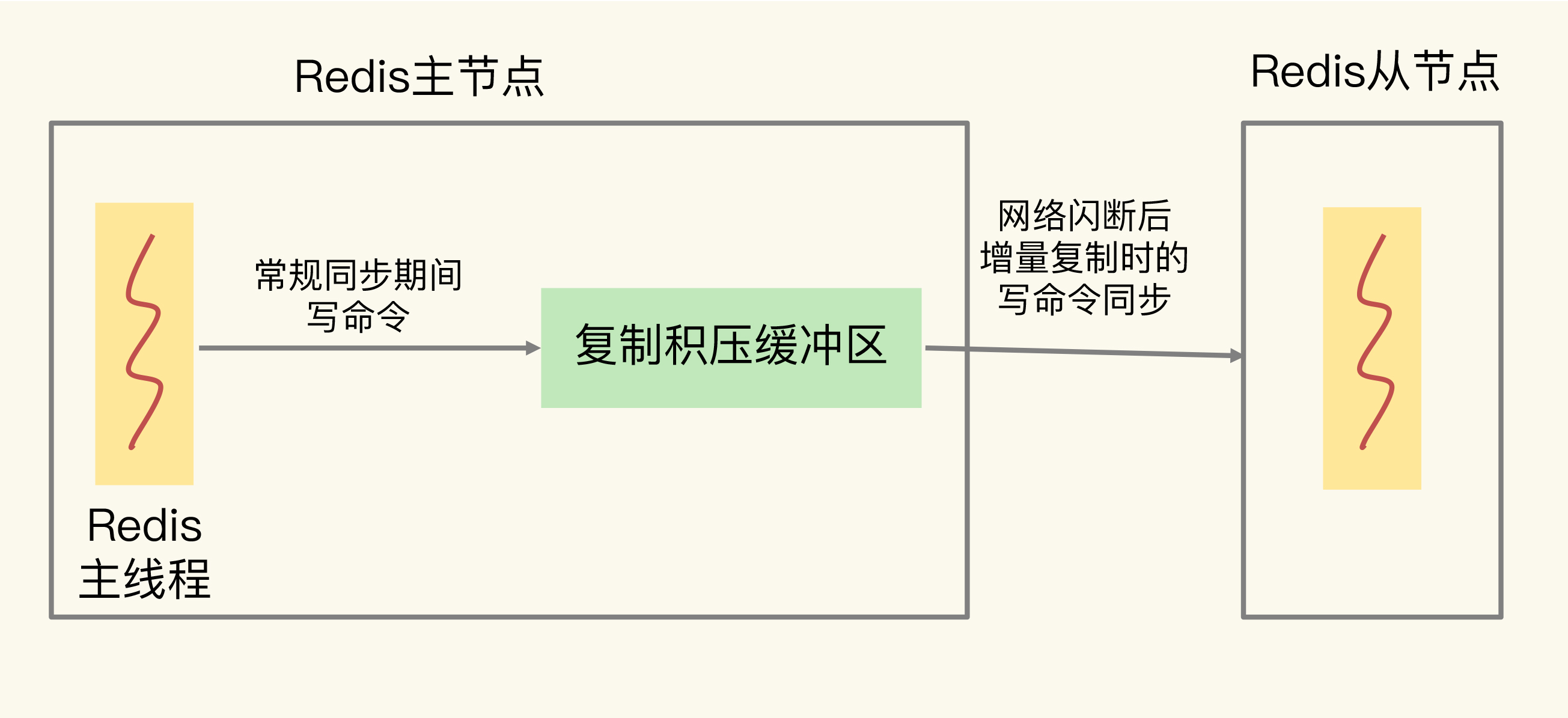 主节点在把接收到的写命令同步给从节点时,同时会把这些写命令写入复制积压缓冲区。一旦从节点发生网络闪断,再次和主节点恢复连接后,从节点就会从复制积压缓冲区中,读取断连期间主节点接收到的写命令,进而进行增量同步,如下图所示: