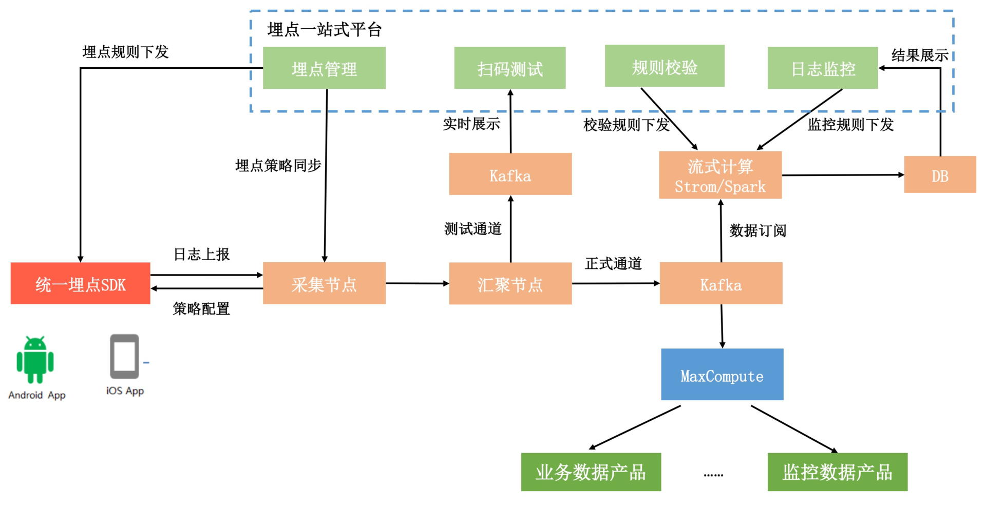 - 埋点管理平台。对应用的整个埋点方案进行统一管理,包括埋点的各个字段的定义和规则,例如对于QQ号这个字段来说,要求是纯数字而且非空的。对于SPM规范,埋点管理平台也会记录每个页面对应的名称,例如淘宝首页会用a123来表示。