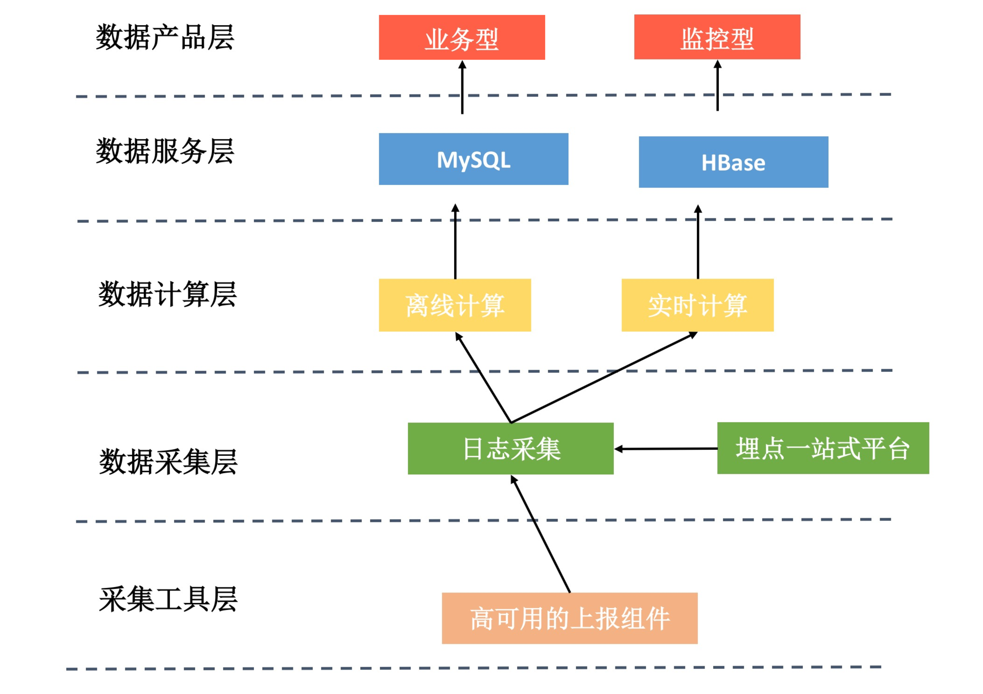 - 采集工具层。应用的上报组件负责数据埋点、日志的组装上报,它需要保证数据的准确性和实时性。