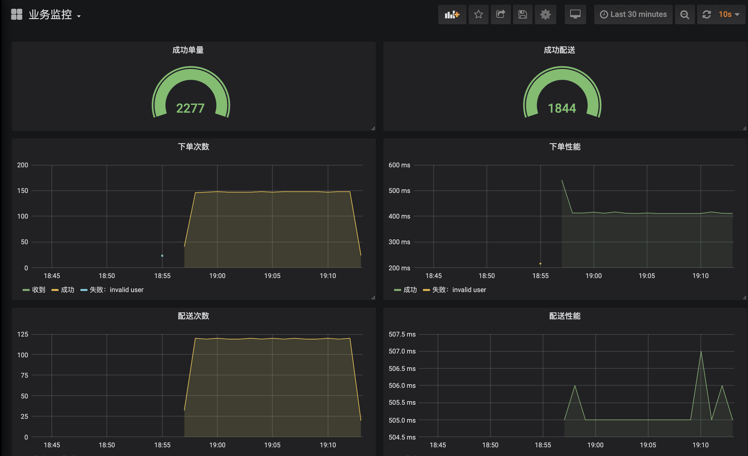 配置好数据源之后,就可以添加一个监控面板,然后在面板中添加各种监控图表。比如,我们在一个下单次数图表中添加了下单收到、成功和失败三个指标。