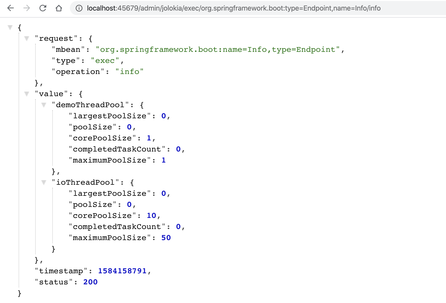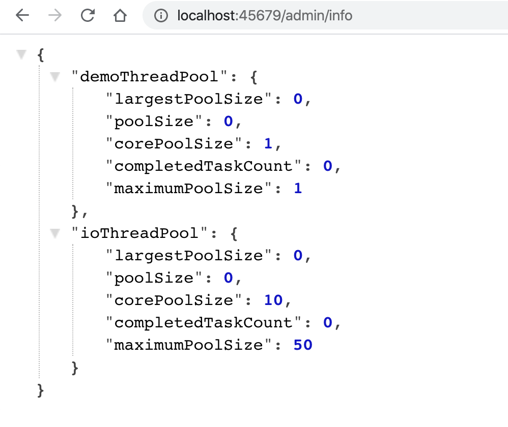 1 2 3 4 5 6 7 8 9 10 11 12 13 14 15 16 17 18 @Component public class ThreadPoolInfoContributor implements InfoContributor { private static Map threadPoolInfo(ThreadPoolExecutor threadPool) { Map<String, Object> info = new HashMap<>(); info.put("poolSize", threadPool.getPoolSize());//当前池大小 info.put("corePoolSize", threadPool.getCorePoolSize());//设置的核心池大小 info.put("largestPoolSize", threadPool.getLargestPoolSize());//最大达到过的池大小 info.put("maximumPoolSize", threadPool.getMaximumPoolSize());//设置的最大池大小 info.put("completedTaskCount", threadPool.getCompletedTaskCount());//总完成任务数 return info; } @Override public void contribute(Info.Builder builder) { builder.withDetail("demoThreadPool", threadPoolInfo(ThreadPoolProvider.getDemoThreadPool())); builder.withDetail("ioThreadPool", threadPoolInfo(ThreadPoolProvider.getIOThreadPool())); } }