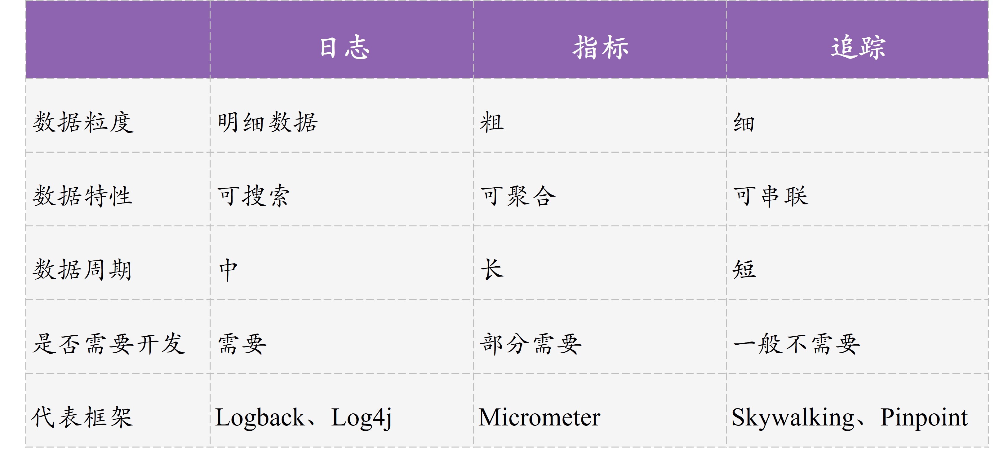 我用一张图对比了日志、指标和追踪的区别和特点: