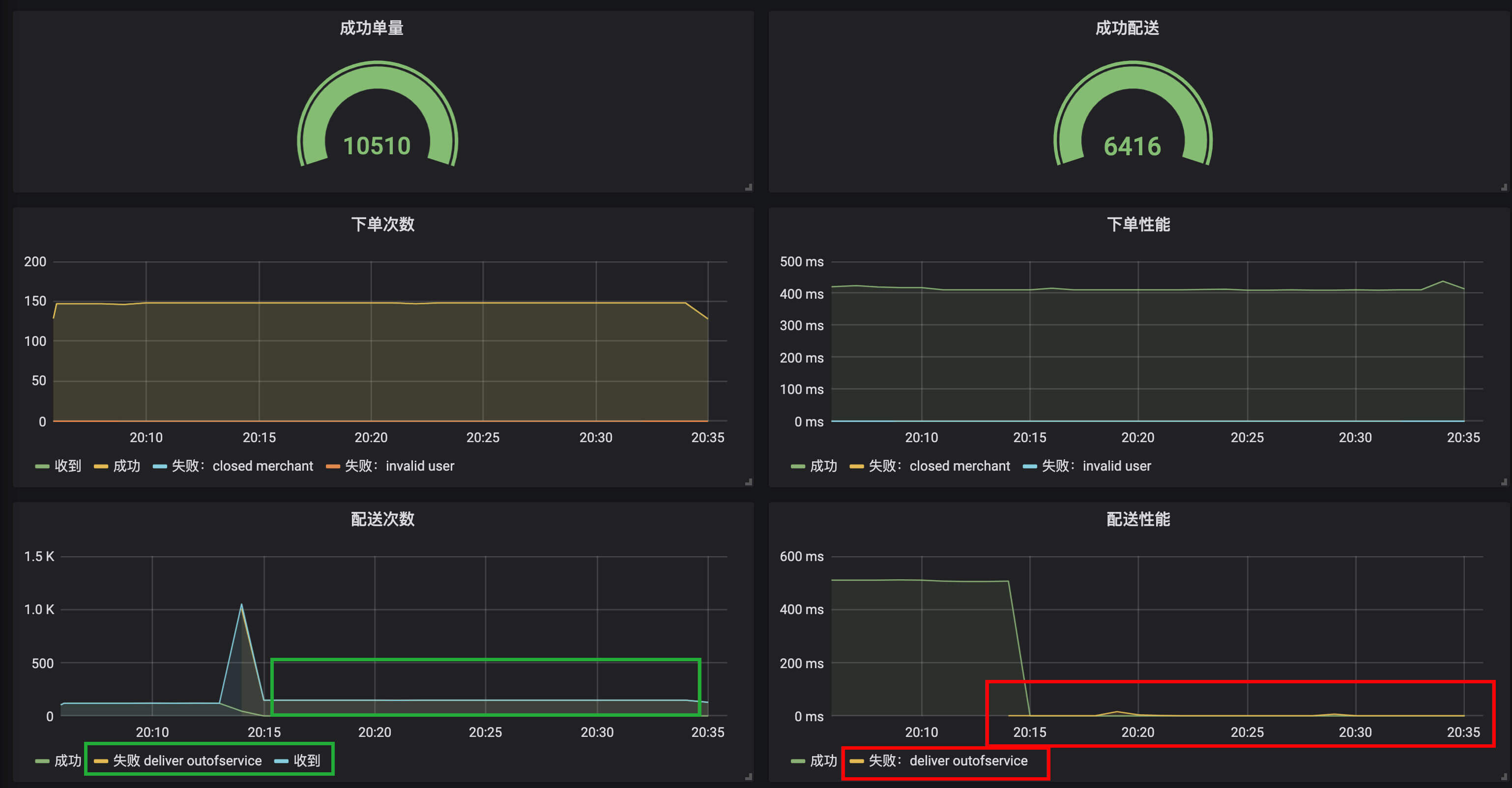 绿色框可以看到,下单现在出现了invalid user这条蓝色的曲线,并和绿色收到下单请求的曲线是吻合的,表示所有下单都失败了,原因是无效用户错误,说明源头并没有问题。 红色框可以看到,虽然下单都是失败的,但是下单操作时间从400ms减少为200ms了,说明下单失败之前也消耗了200ms(和代码符合)。而因为下单失败操作的响应时间减半了,反而导致吞吐翻倍了。 观察两个配送监控可以发现,配送曲线出现掉0现象,是因为下单失败导致的,下单失败MQ消息压根就不会发出。再注意下蓝色那条线,可以看到配送曲线掉0延后于下单成功曲线的掉0,原因是配送走的是异步流程,虽然从某个时刻开始下单全部失败了,但是MQ队列中还有一些之前未处理的消息。