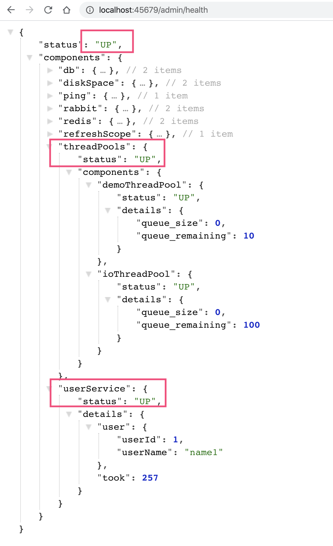 程序启动后可以看到,health接口展现了线程池和外部服务userService的健康状态,以及一些具体信息: