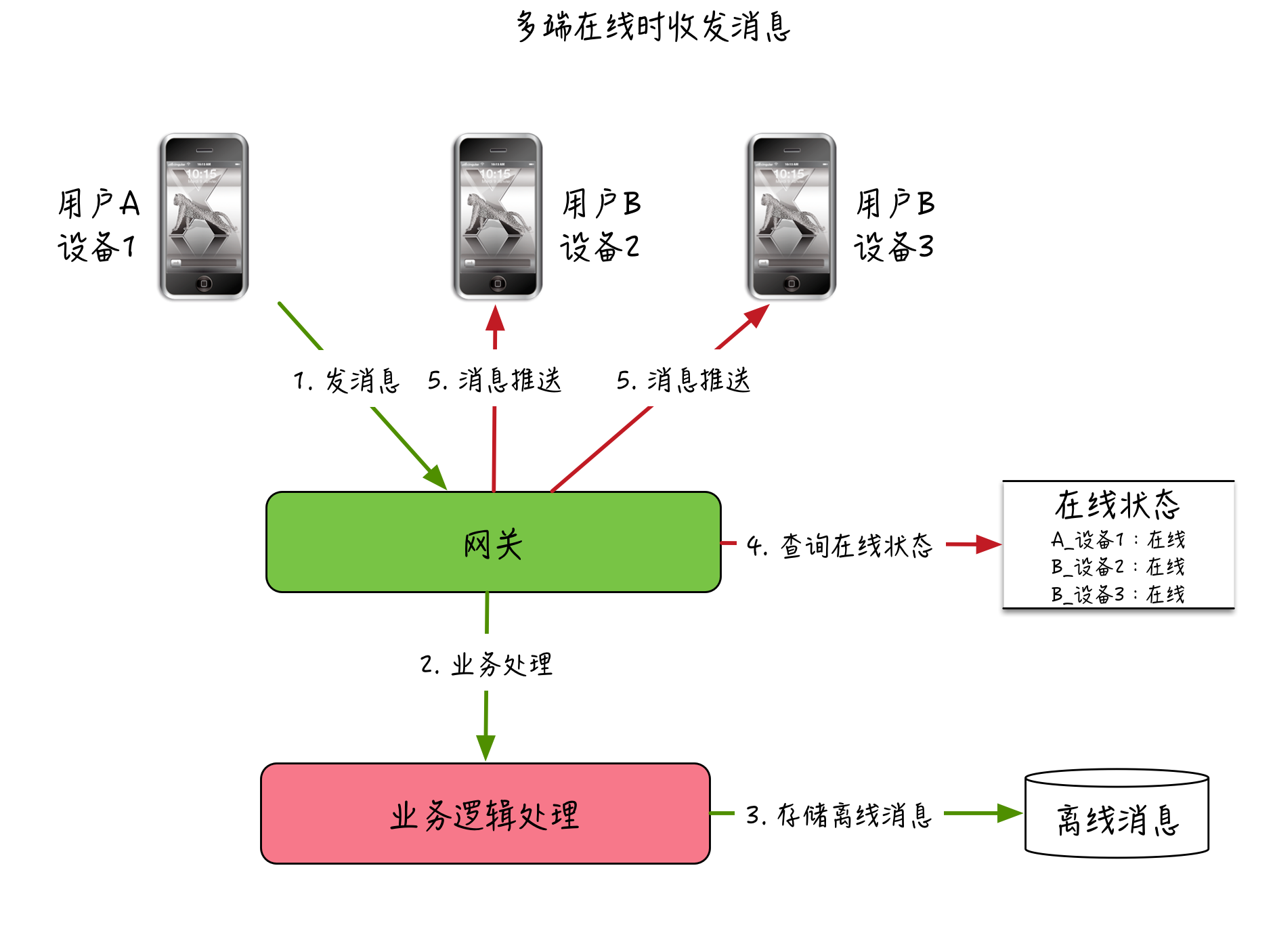 下面,我简单把“多端在线时消息收发的过程”和“离线设备上线时同步消息的过程”画了一下。你可以自行参考,这里就不作具体说明了。