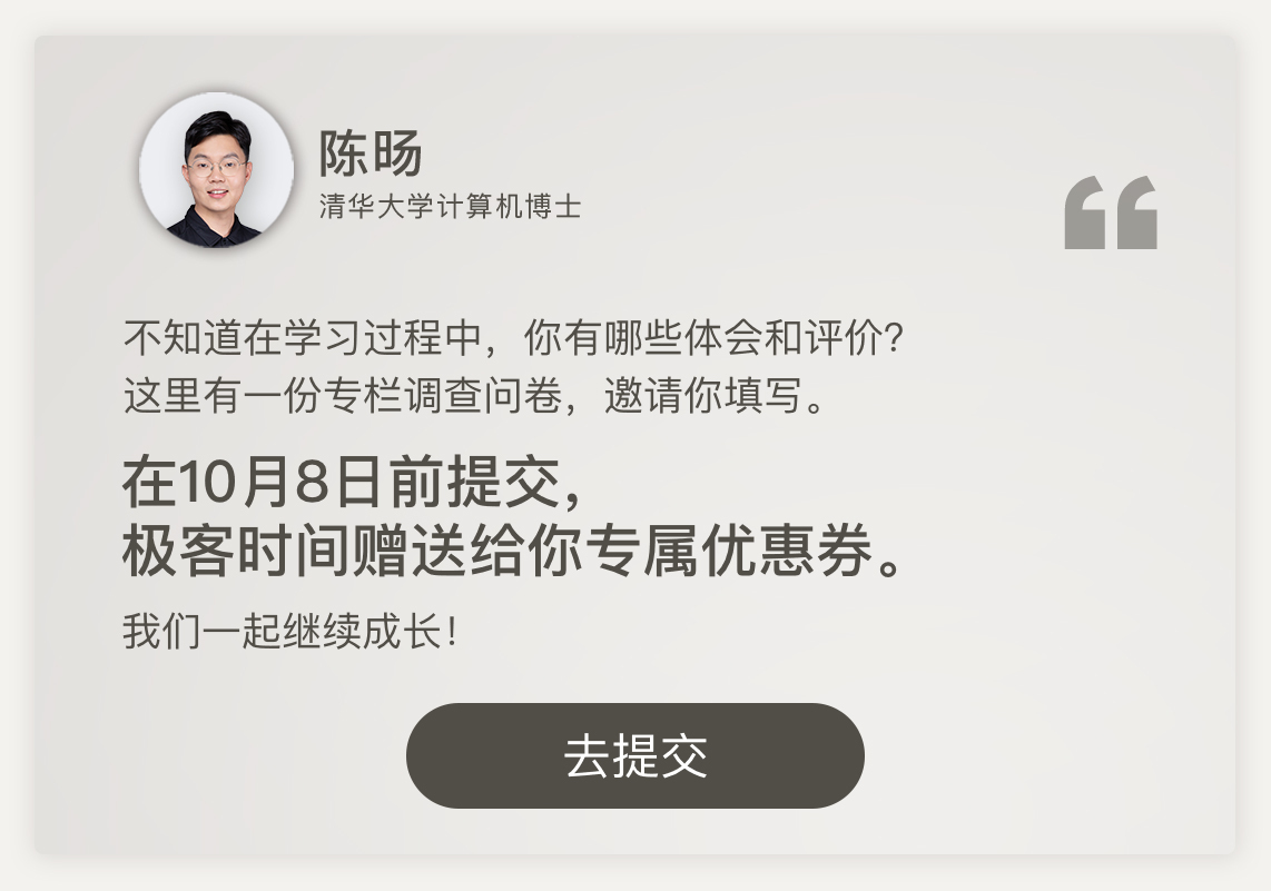 最后文章结尾处有一份调查问卷,希望你可以抽出两三分钟填写一下。我想认真倾听你对这个专栏的意见或者建议,期待你的反馈!