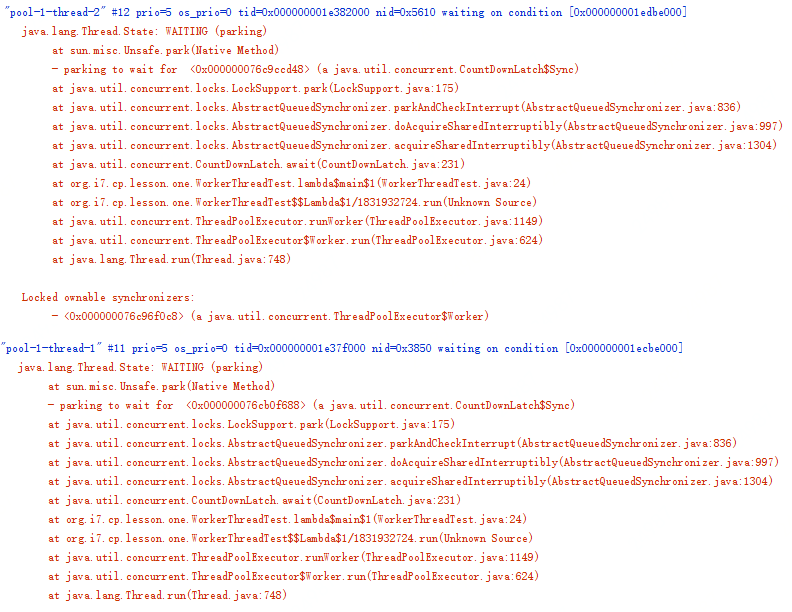 当应用出现类似问题时,首选的诊断方法是查看线程栈。下图是上面示例代码停止响应后的线程栈,你会发现线程池中的两个线程全部都阻塞在 l2.await(); 这行代码上了,也就是说,线程池里所有的线程都在等待L2阶段的任务执行完,那L2阶段的子任务什么时候能够执行完呢?永远都没那一天了,为什么呢?因为线程池里的线程都阻塞了,没有空闲的线程执行L2阶段的任务了。