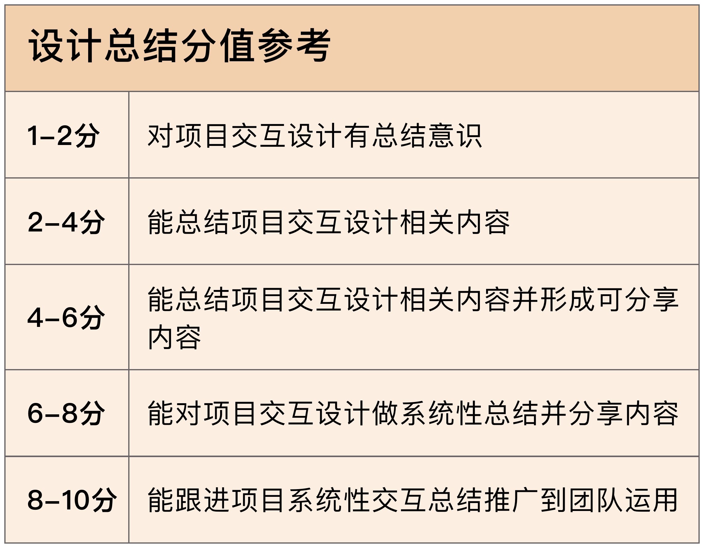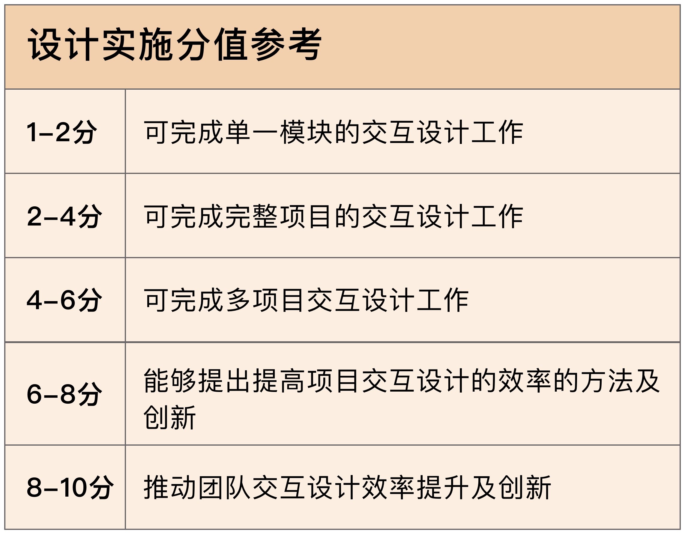 同样,我会重点拆解设计定位和设计技能两项能力,设计实施和设计总结部分我给了评分表。