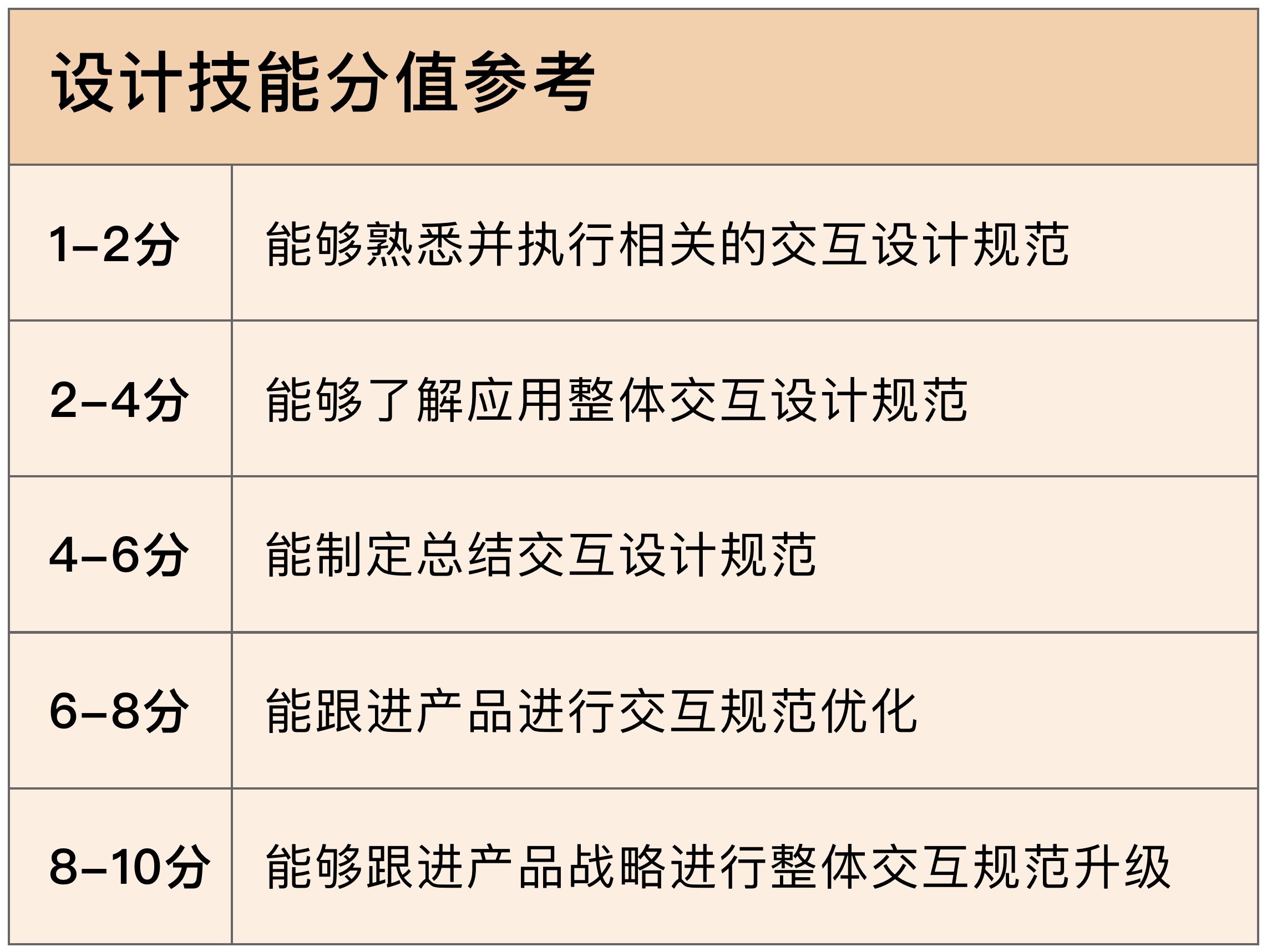 如果我们能用量化的方式,给设计师的能力做个定级,那么我们在面试设计师的时候,我们就会有更多的把握。同时,我们还可以用这种方式,来审视自己身上的能力和不足。