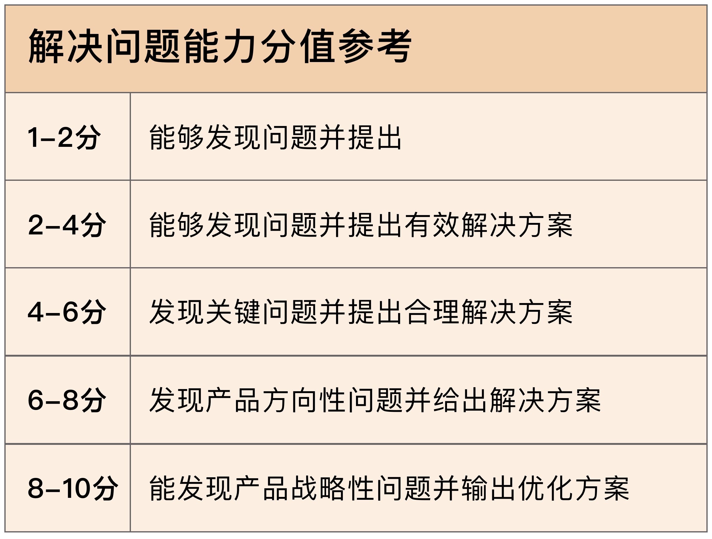 我们再来看通用能力的第二项:解决问题能力。我们同样用一句话来定义这种能力,就是设计师能否发现并解决问题,解决的是哪种问题。根据这个定义,我们同样可以得出一份评分表。