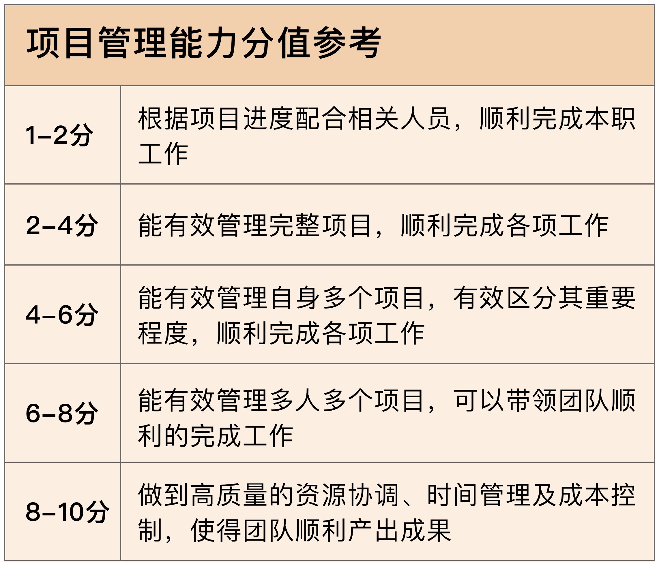 说完了沟通能力和解决问题能力,还有执行力和项目管理的能力,因为后两个比较容易理解,所以我就不做过多的展开,但是你可以对照我给出的评分表,评价自己其余两项能力的分数。