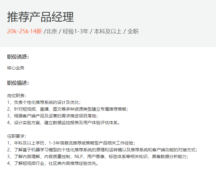 **关于岗位,无论你要转型成为哪类产品经理,都要时刻关注目前互联网公司中的招聘。**对于推荐产品岗位,除了要知道我们今天讲的内容,你还要注重积累推荐策略、推荐效果数据分析,以及产品的优化升级方面的经验。我在下面列举了一个市场上推荐产品经理的 JD,你可以参考下。