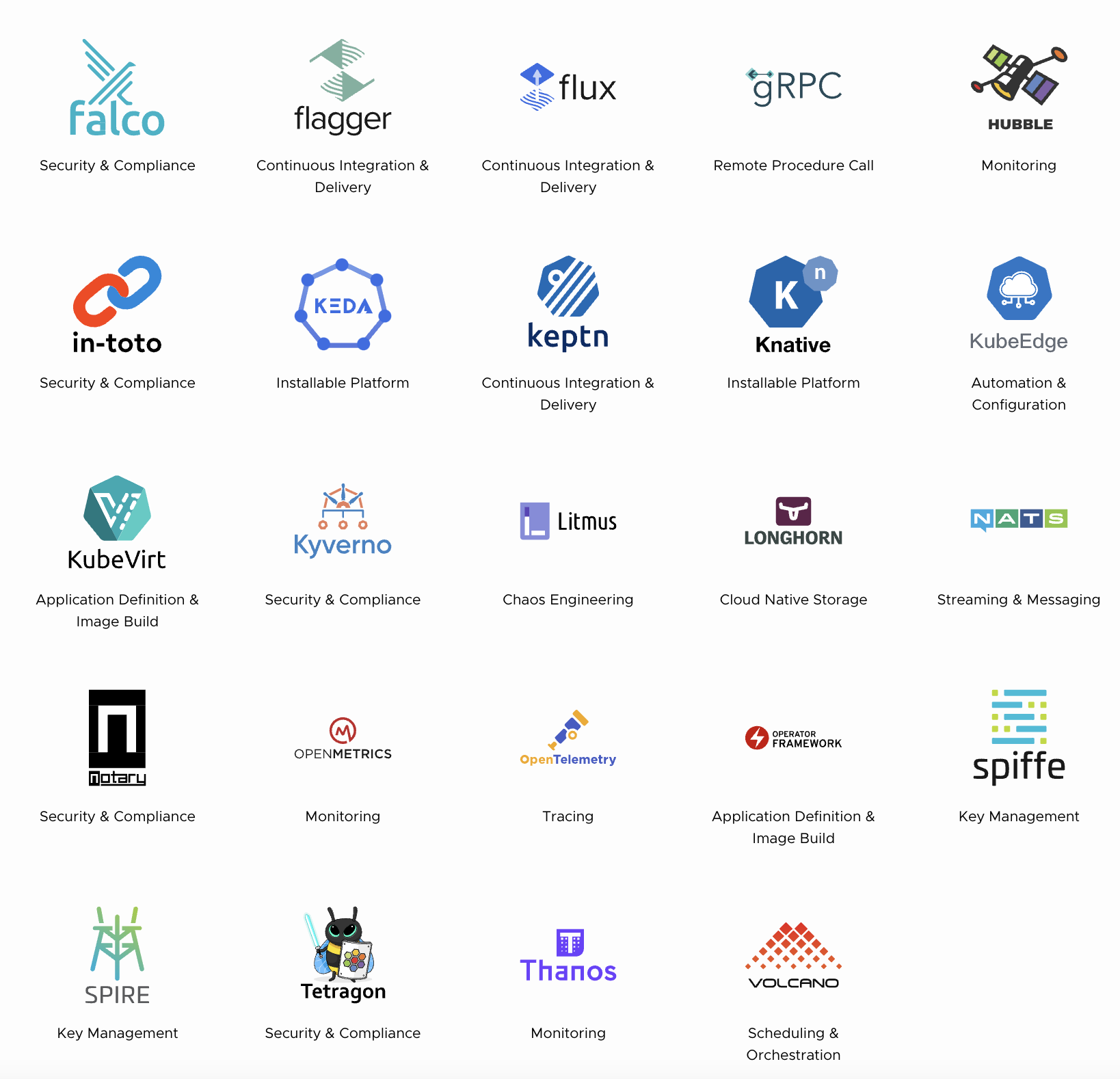 CNCF全景图里的项目非常多,其中由它托管的项目又分成毕业(Graduated)项目、孵化(Incubating)项目和沙盒(Sandbox)项目。