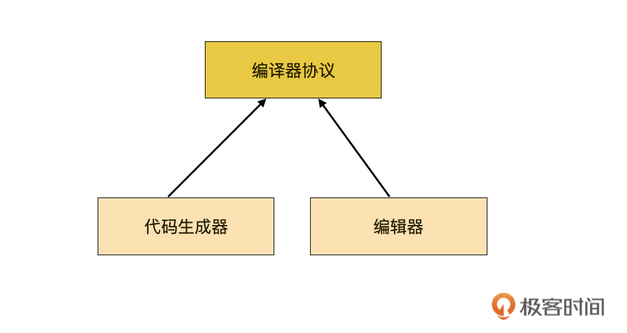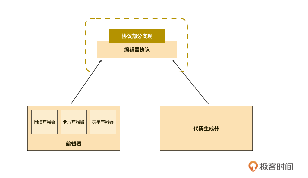 代码生成器和编辑器处于同一层级,并且引入了协议层。协议层的作用之一,就是对生成代码各种功能的API做出抽象和约束。代码生成器主要职责是实现这些协议,而编辑器的主要职责则是调用协议层提供的API来完成代码生成等一系列上层活动。