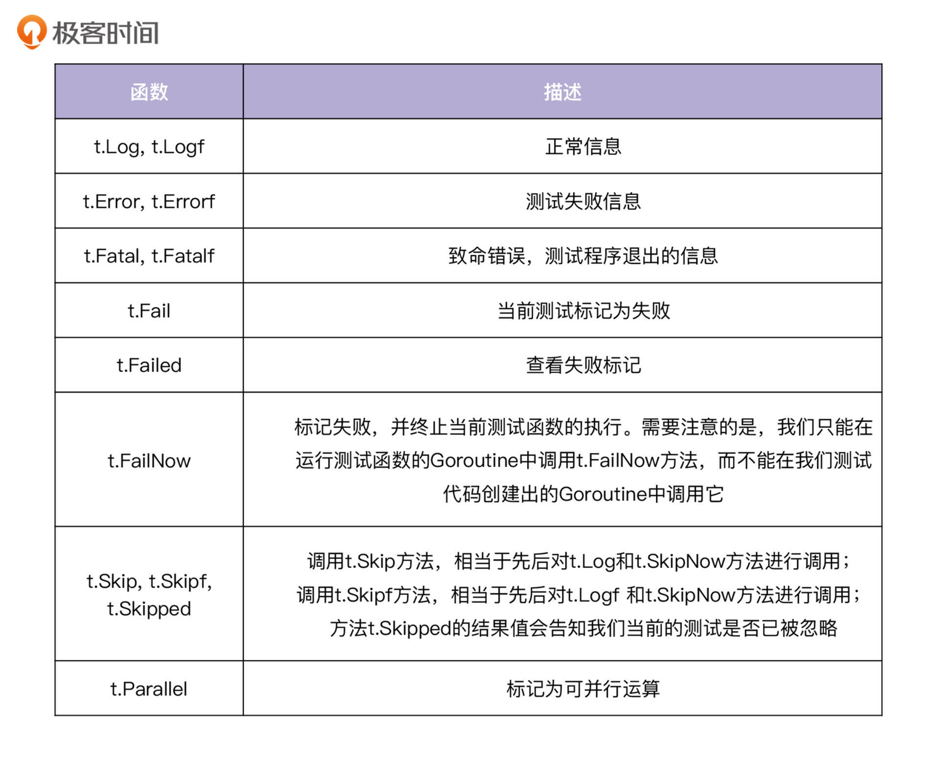 我们可以调用 testing.T 的 Error 、Errorf 、FailNow 、Fatal 、FatalIf 方法,来说明测试不通过;调用 Log 、Logf 方法来记录测试信息。函数列表和相关描述如下表所示:
