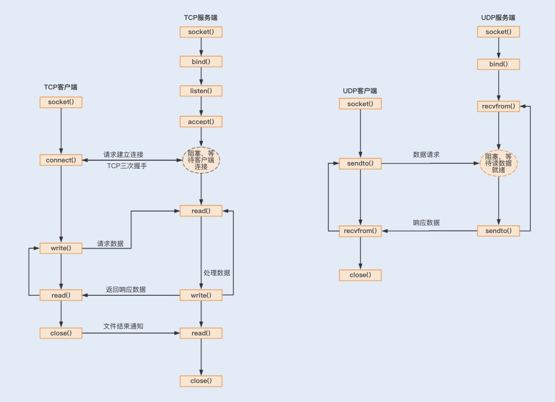 要实现不同机器间的网络通信,我们先要了解计算机系统网络通信的基本原理。网络通信是两台设备之间实现数据流交换的过程,是基于网络传输协议和传输数据的编解码来实现的。其中网络传输协议有TCP、UDP协议,这两个协议都是基于Socket编程接口之上,为某类应用场景而扩展出的传输协议。通过以下两张图,我们可以大概了解到基于TCP和UDP协议实现的Socket网络通信是怎样的一个流程。