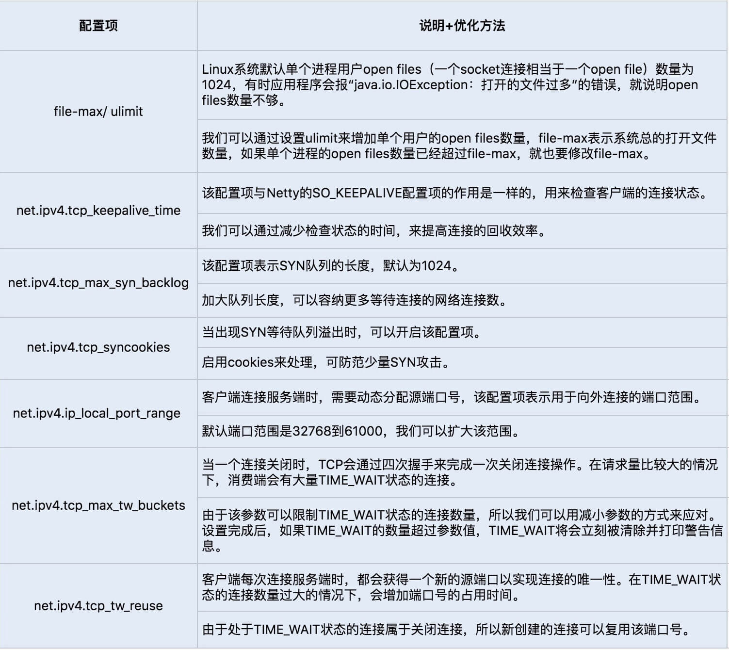 除了以上这些优化,我们还可以针对套接字编程提供的一些TCP参数配置项,提高网络吞吐量,Netty可以基于ChannelOption来设置这些参数。