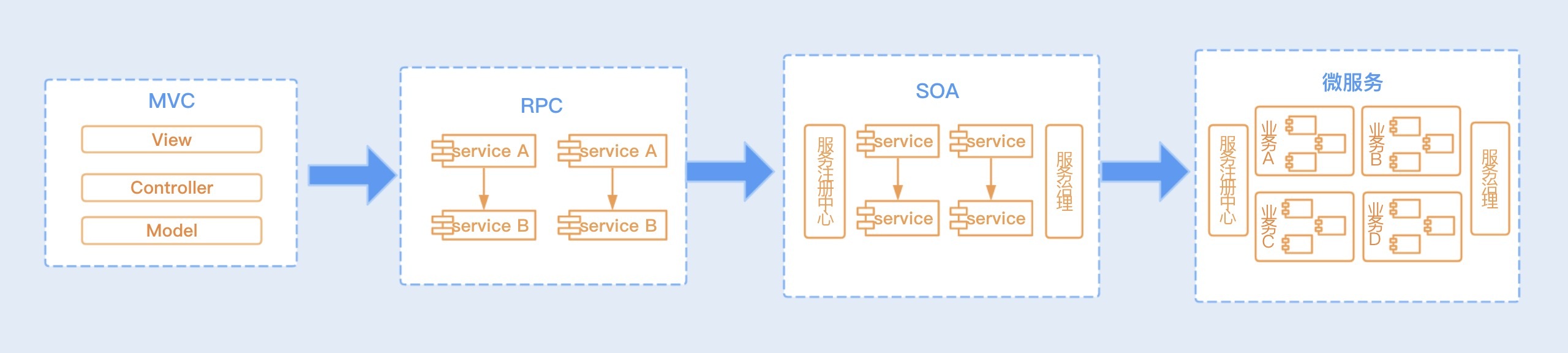 一提到RPC,你是否还想到MVC、SOA这些概念呢?如果你没有经历过这些架构的演变,这些概念就很容易混淆。你可以通过下面这张图来了解下这些架构的演变史。
