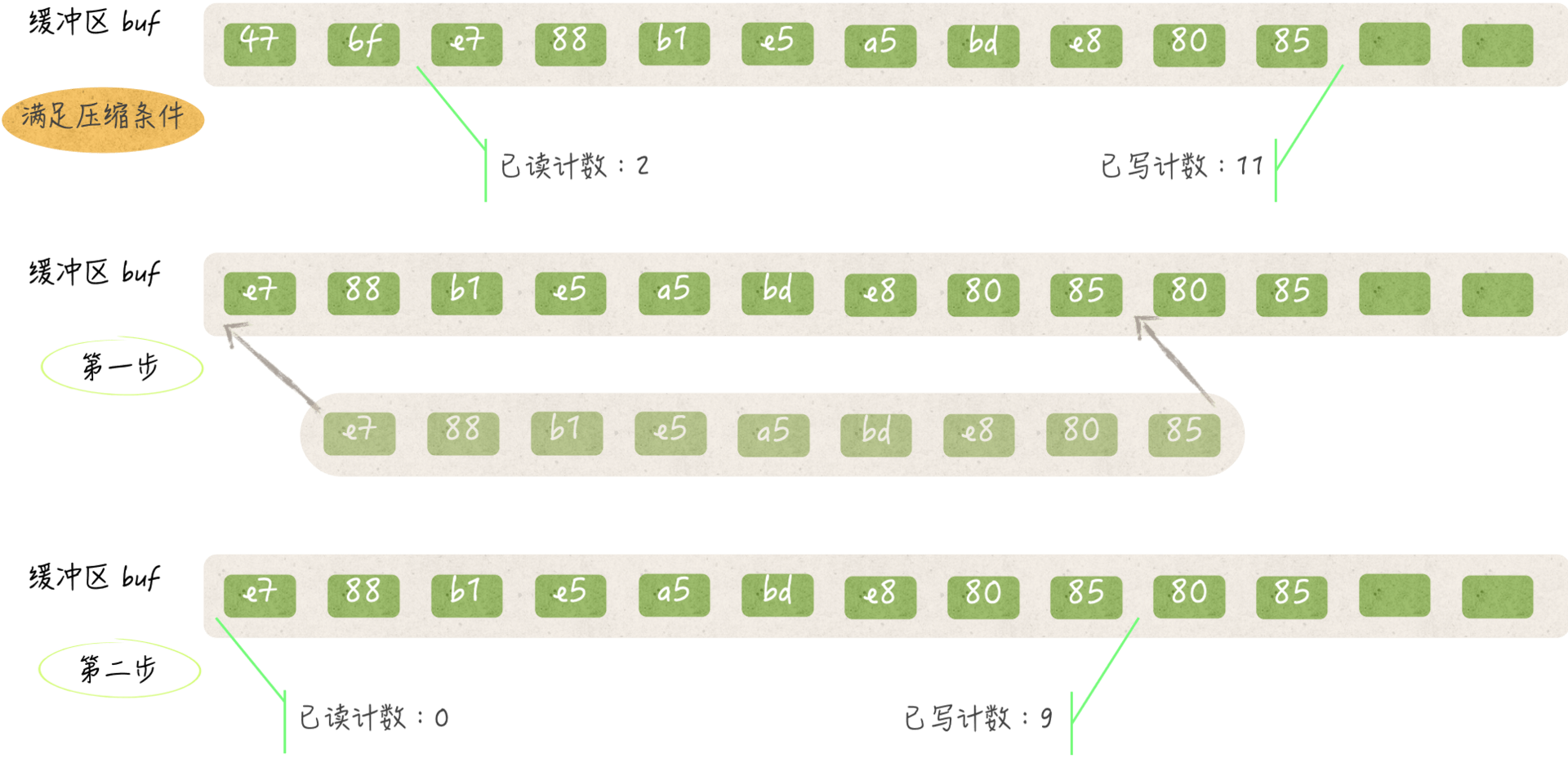 对缓冲区的压缩包括两个步骤。第一步,把缓冲区中在[已读计数, 已写计数)范围之内的所有元素值(或者说字节)都依次拷贝到缓冲区的头部。