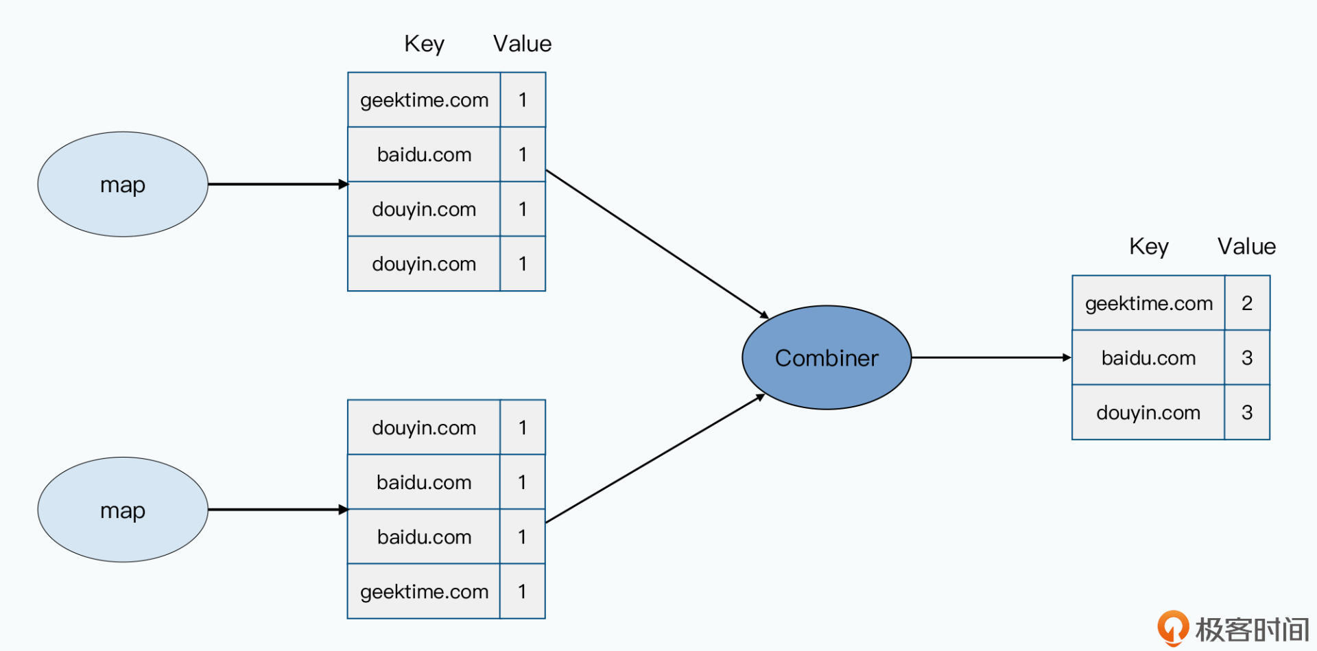 我就以域名的访问次数为例,它的数据分布一定有很强的头部效应,少量20%的域名可能占了80%的访问记录。这样一合并,我们要传输的数据至少可以减少60%。如果考虑一台16核的服务器,有16个map的worker运行,应该还能再减少80%以上。这样,通过一个中间的Combiner,我们要传输的数据一下子就下降了两个数量级,大大缓解了网络传输的压力。