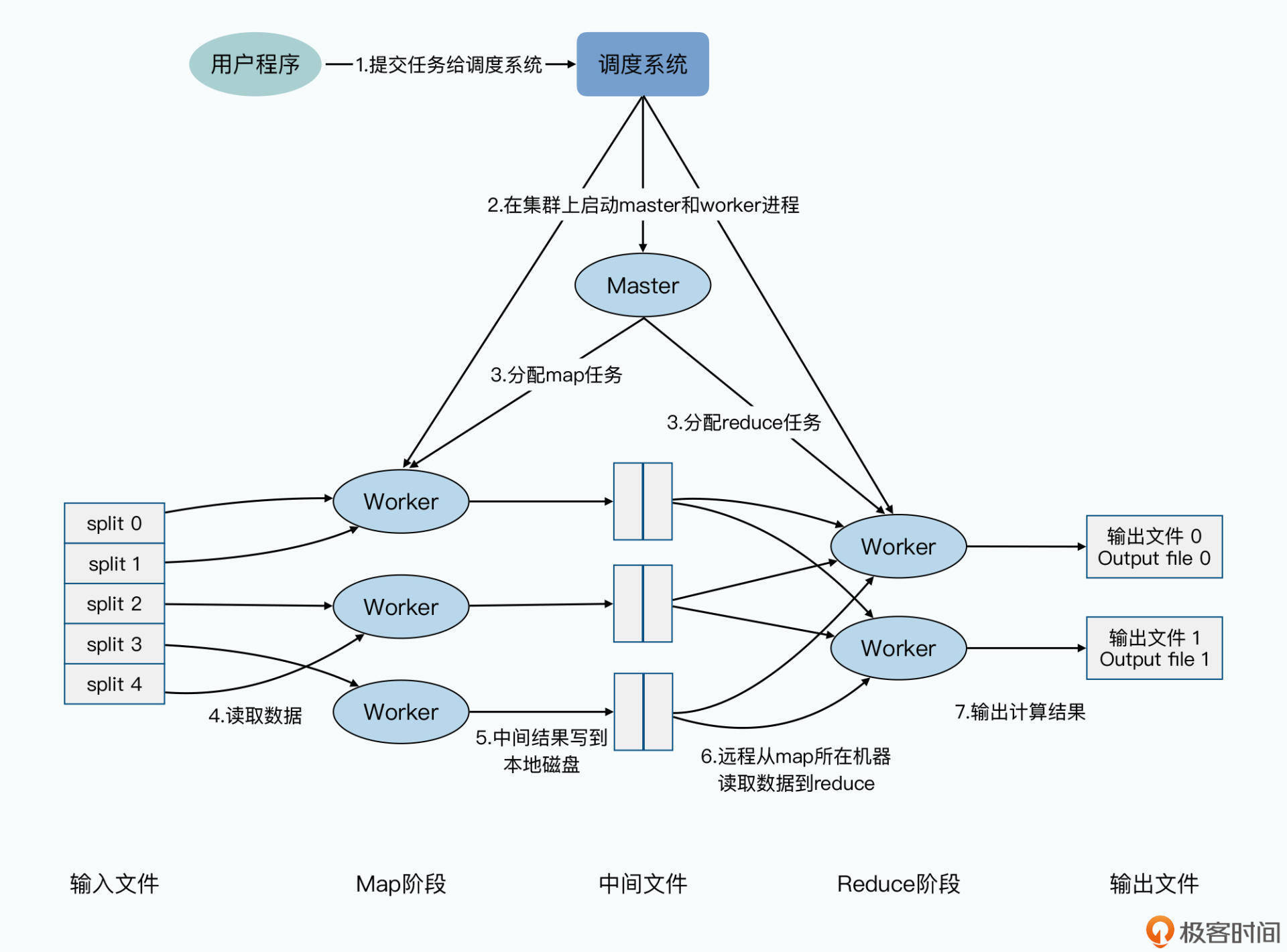 而谷歌在论文里面,也通过第三部分的“MapReduce的实现”,以及第四部分的“MapReduce的完善”,很好地回答了怎么解决这三个问题。下面,我们就来具体看看,论文里是怎么讲的。