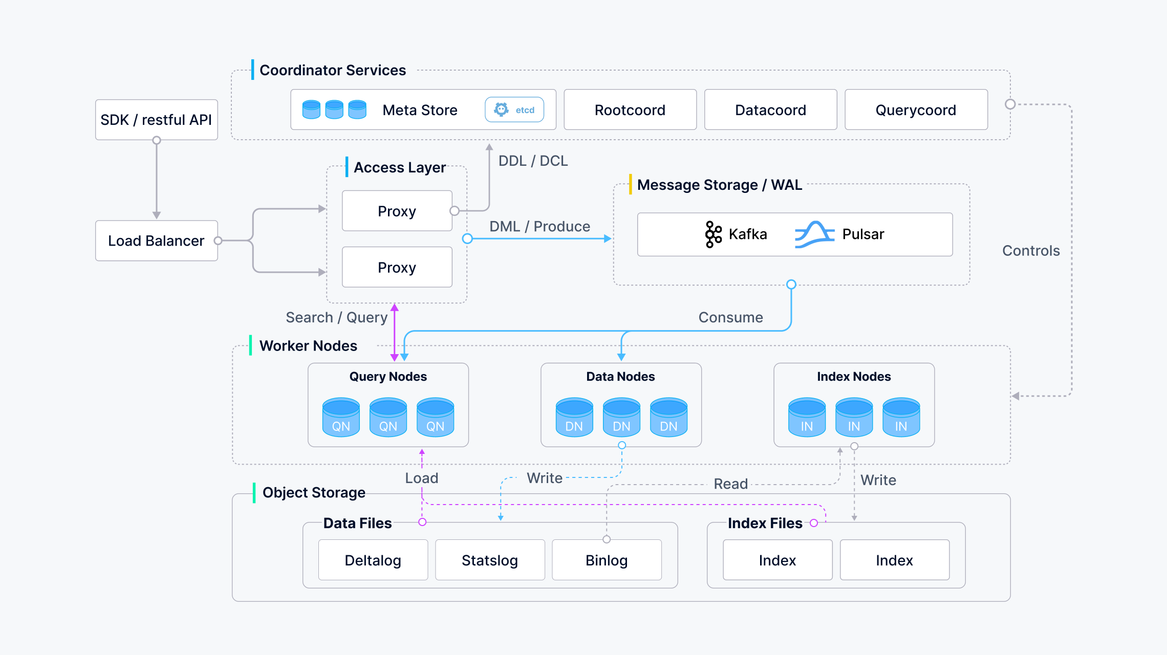 - Meta Storage存储元数据的快照,比如数据库schema、日志消费checkpoint等,为了保障存储元数据需要极高的可用性、强一致性和事务支持,Milvus使用etcd存储元数据。