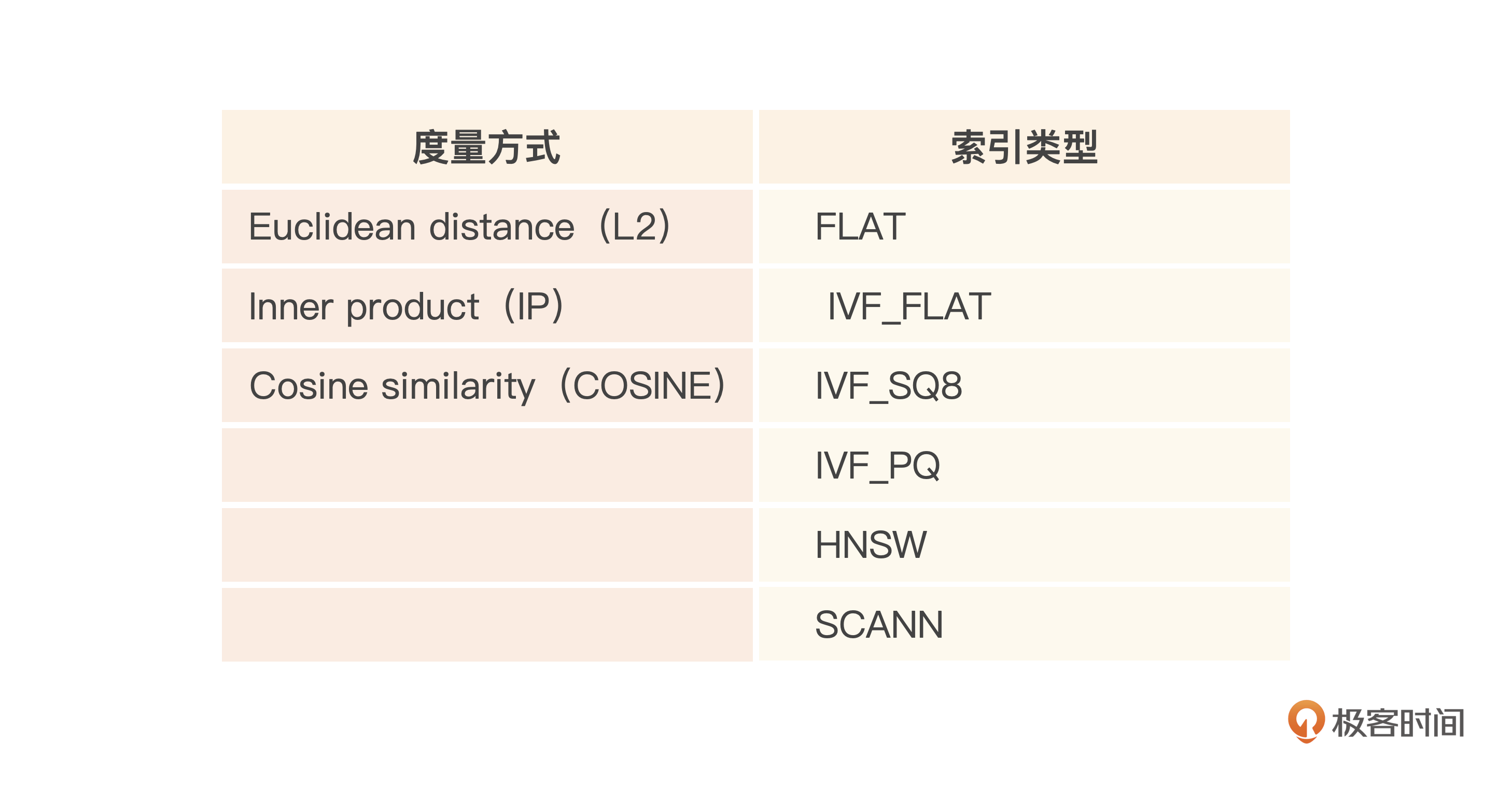 In-Memory Index是最常用的向量索引方式,向量索引基于内存存储。其实跟Faiss类似,支持多种ANNS算法索引与度量方式,两者组合就形成了一个索引类型。以浮点数向量索引为列,你可以参考下表: