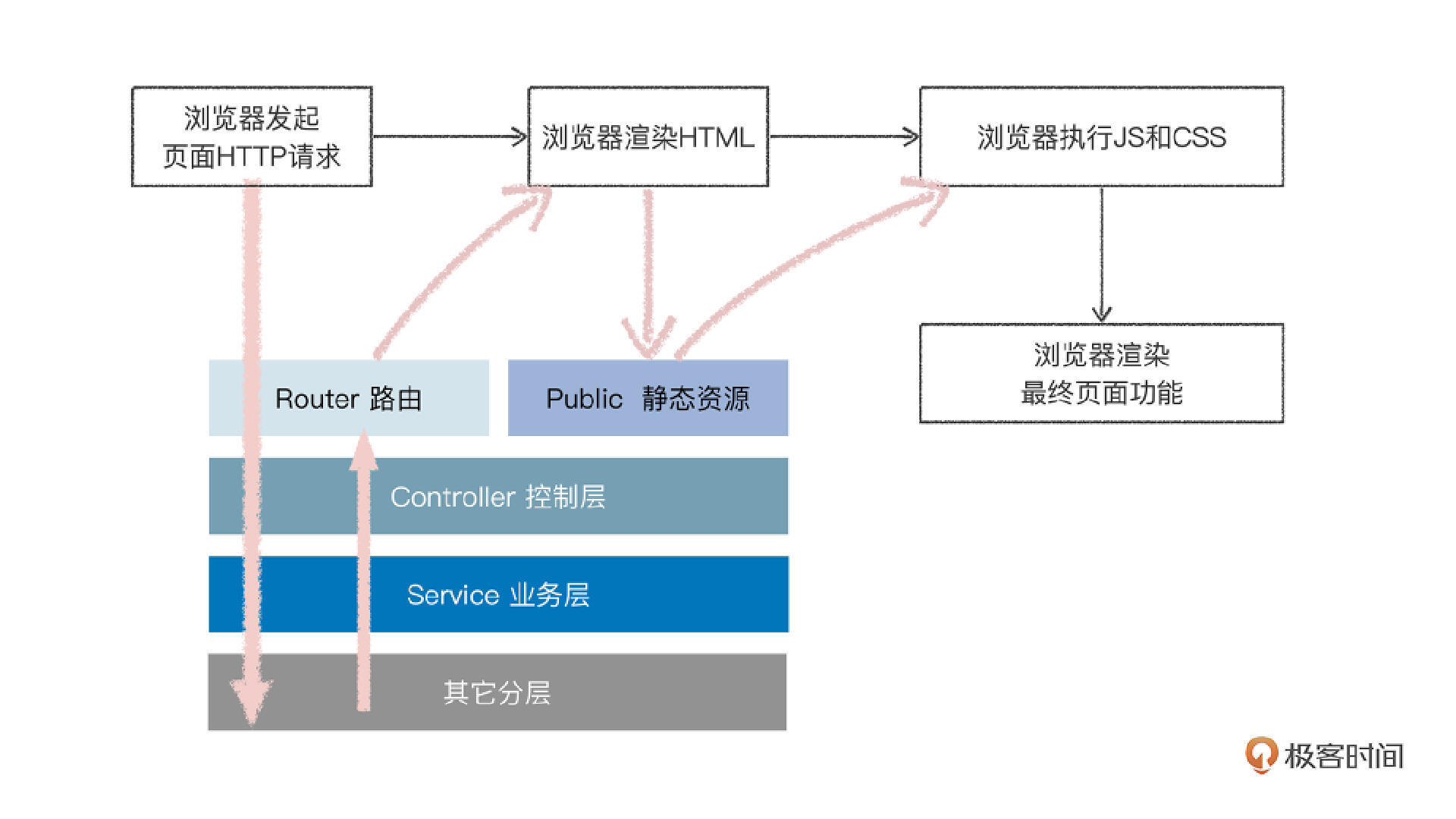 现在,我们已经成功实现了一个基于Koa.js的Web服务,接下来,就要集合上节课的前端代码,整合前后端分离的全栈项目。这里你估计会有疑问,为什么需要做项目的前后端分离呢?