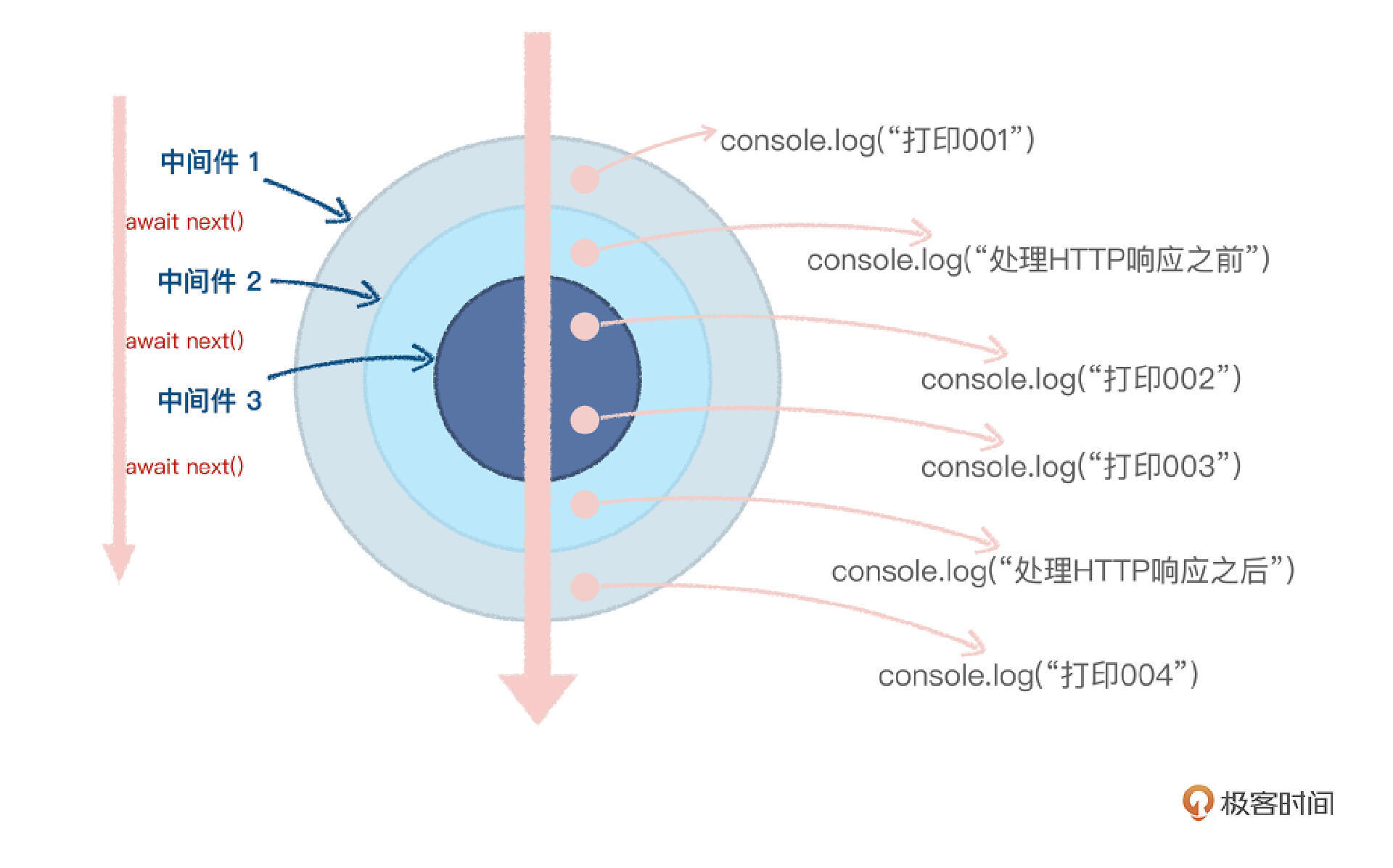 我们主要用到Web框架是Koa.js,那么它核心的分析服务设计理念,就是处理HTTP请求的中间件流程设计,也就是“洋葱模型”。这我先给你展示一段代码:
