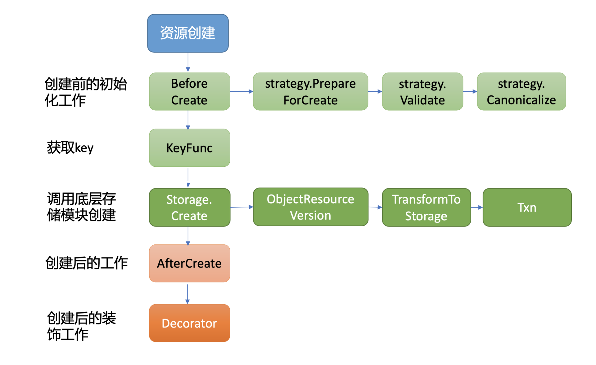 从图中你可以看到,创建一个资源主要由BeforeCreate、Storage.Create以及AfterCreate三大步骤组成。