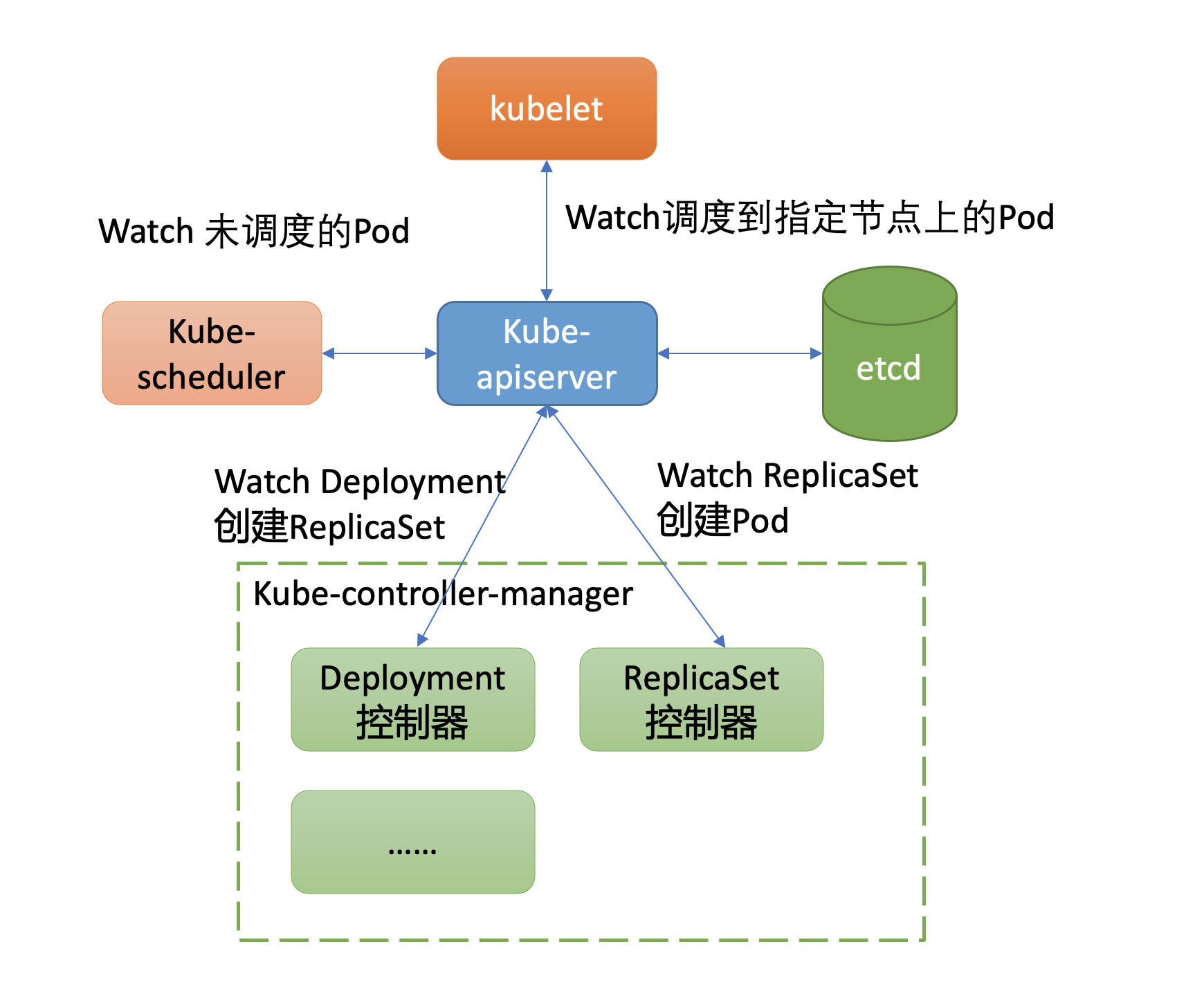 - kube-controller-manager包含一系列的控制器组件,比如Deployment、StatefulSet等控制器。控制器的核心思想是监听、比较资源实际状态与期望状态是否一致,若不一致则进行协调工作使其最终一致。