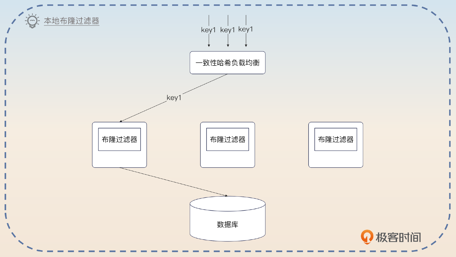 当看到本地两个字的时候,我不知道你有没有想起前面很多节课里面,我都提过类似的解决方案。这里我要再一次使用本地内存来进一步提高性能了。整体思路是利用一致性哈希等类型的算法执行负载均衡,确保同一个 key 的请求落到同一个实例上,那么我就可以在这台机器上使用基于本地内存的布隆过滤器了。